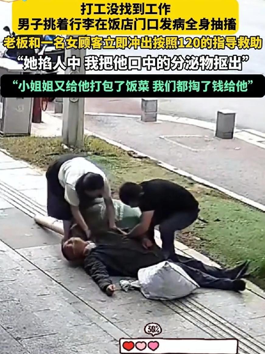 打工没找到工作,男子挑着行李走到饭店门口发病全身抽搐。老板和一名白衣女立即冲出按120的指示救助。二人把他口中分泌物抠出。又从男子口袋里掏出一粒药给他喂到嘴里,不一会男子病情平稳,感动的男子给二位恩人下跪,白衣女子立刻上前阻止,得知大哥家中就一个人,于是,给他打包了饭菜并塞给了他一些钱,看着白衣女子为男子忙前忙后想的这么周到,真是不是家人胜似家人,一个人带病在外找工作不容易,找份挣钱多又稳定的工作更难,但愿遇到好老板能给他一份稳定的工作!