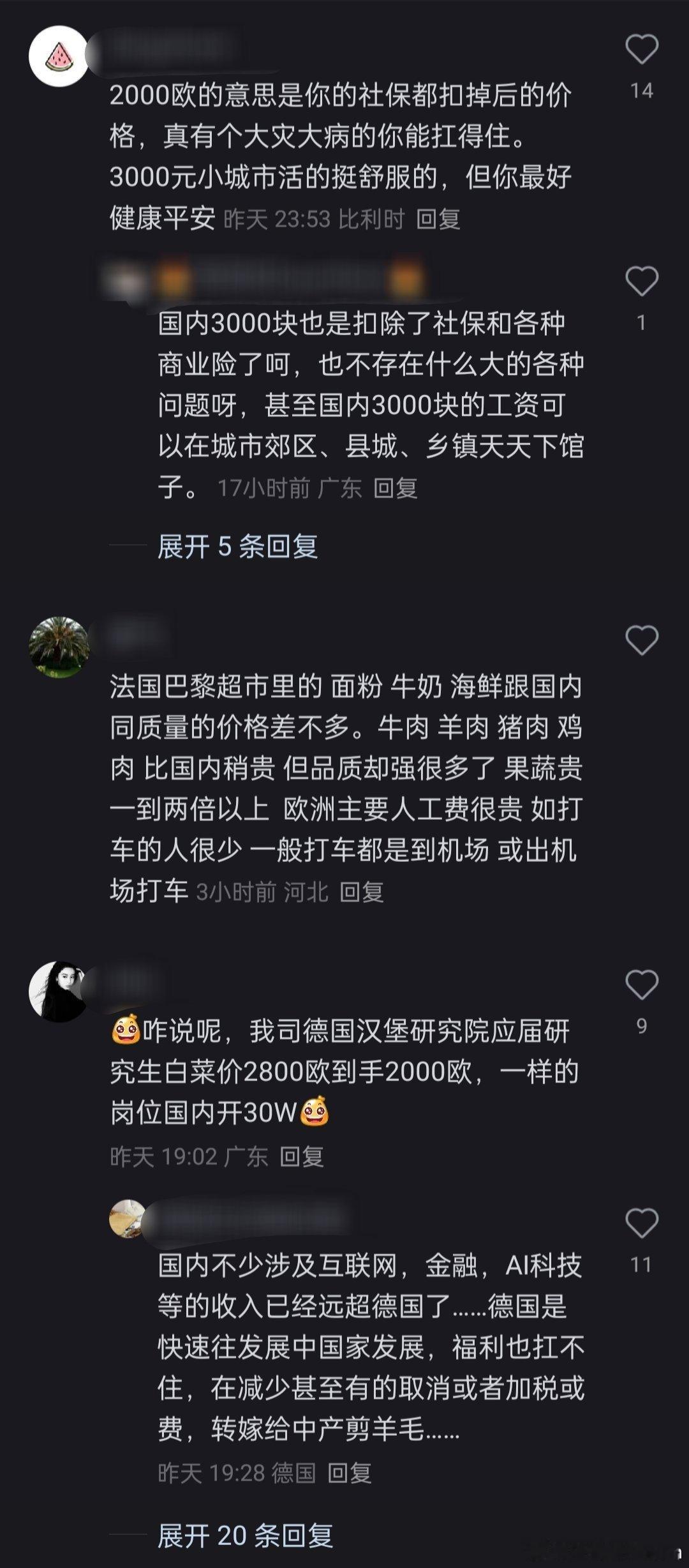 最近有网友提出了一个新概念:欧洲工资的购买力,2000欧元=国内3000元。[哆啦A梦吃惊][哆啦A梦吃惊]
