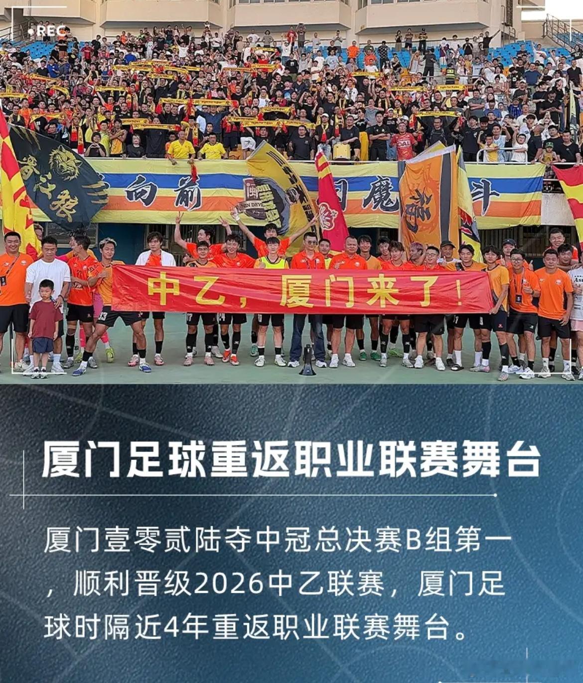 今年厦门壹零贰陆在中冠联赛打出好成绩,最终以分组第一提前锁定中乙名额!2025年,厦门足球重回职业化舞台。