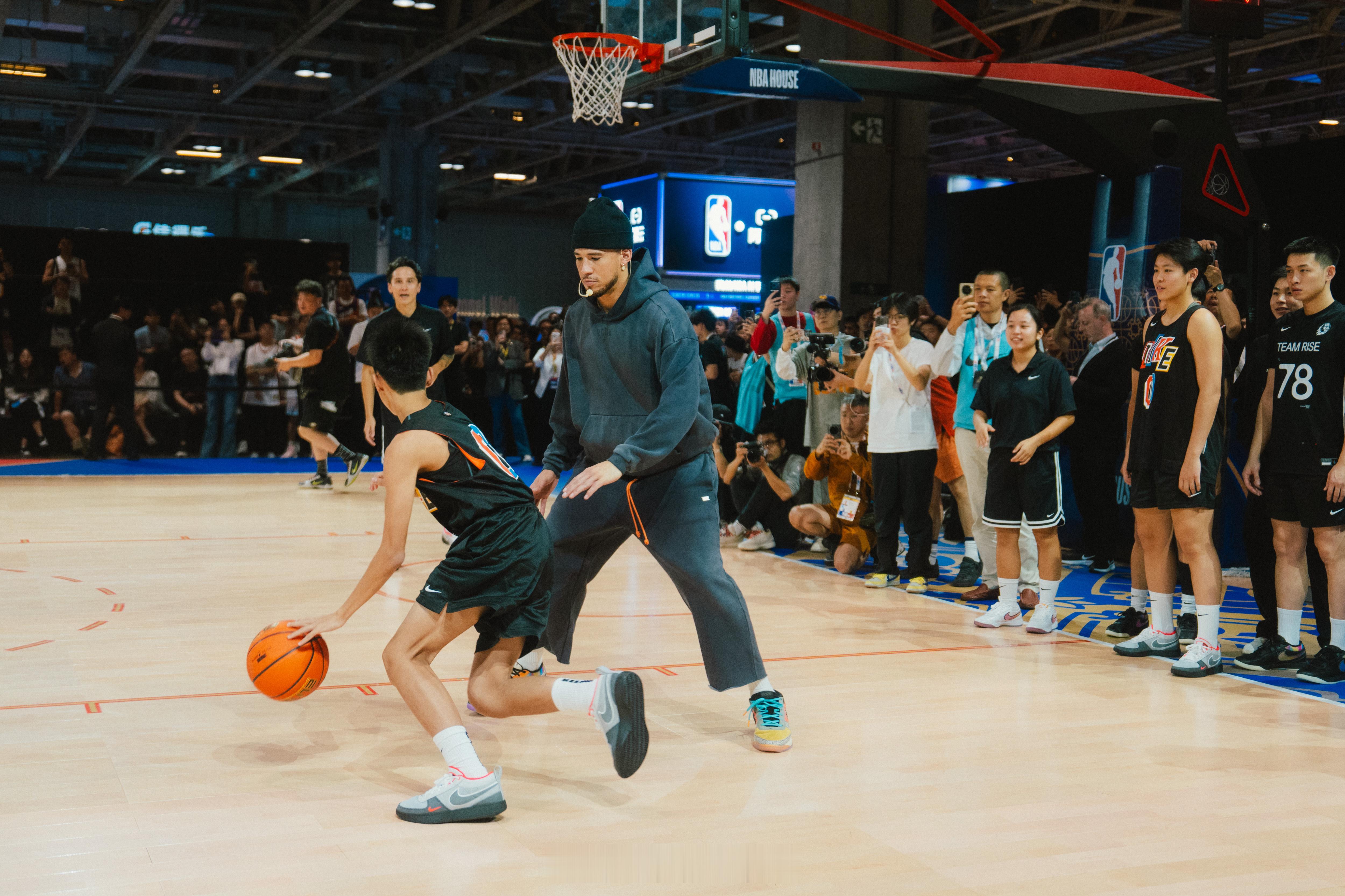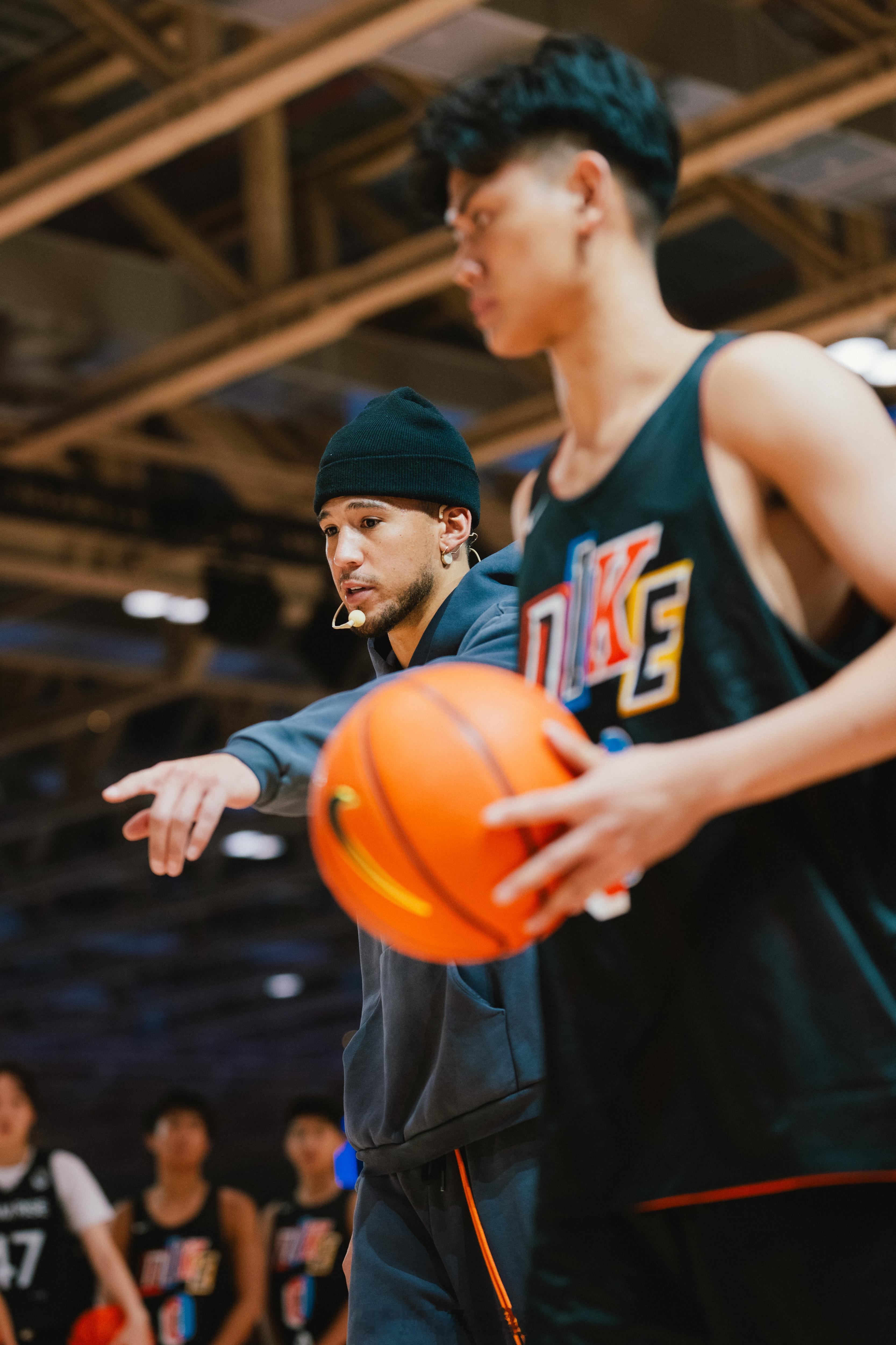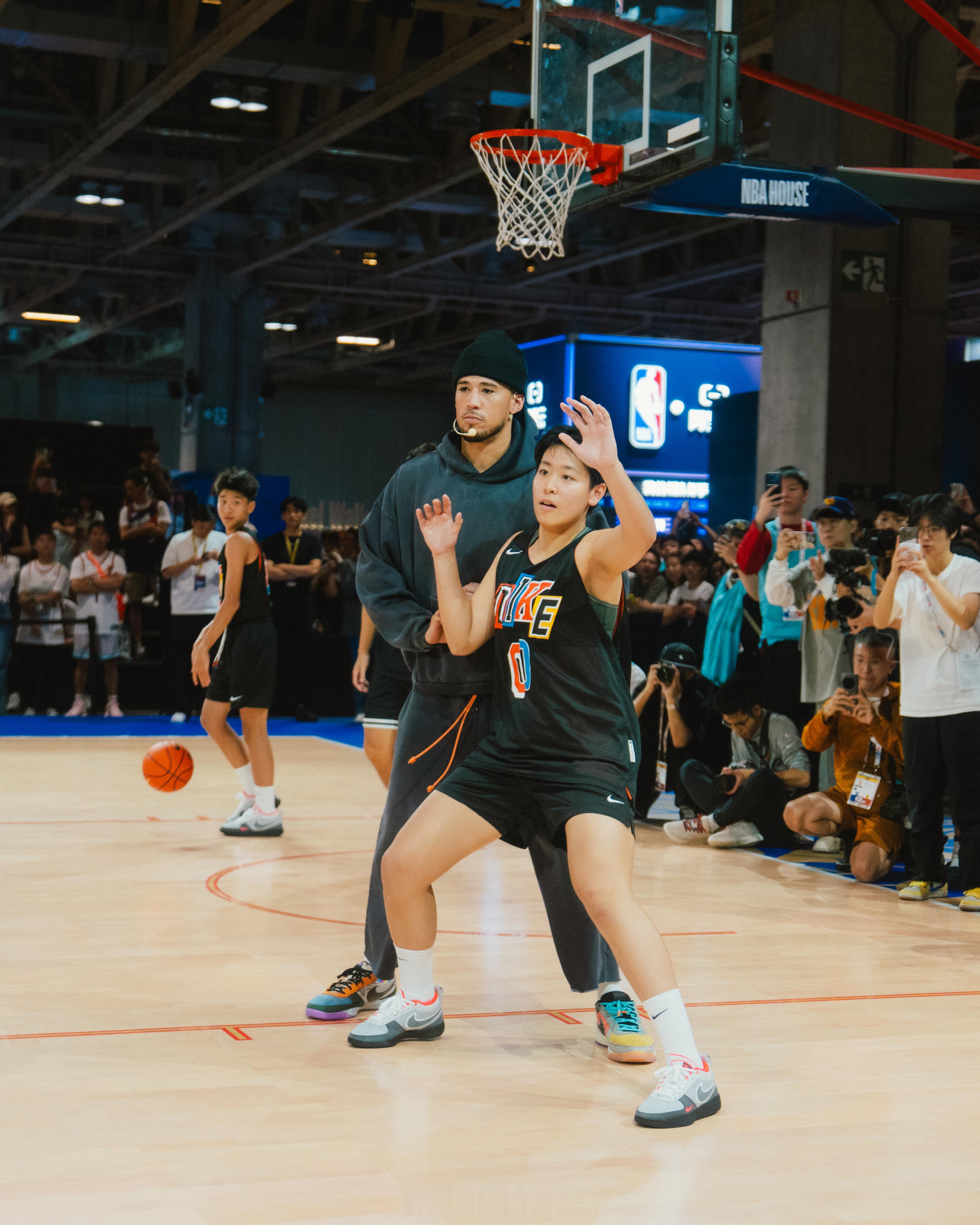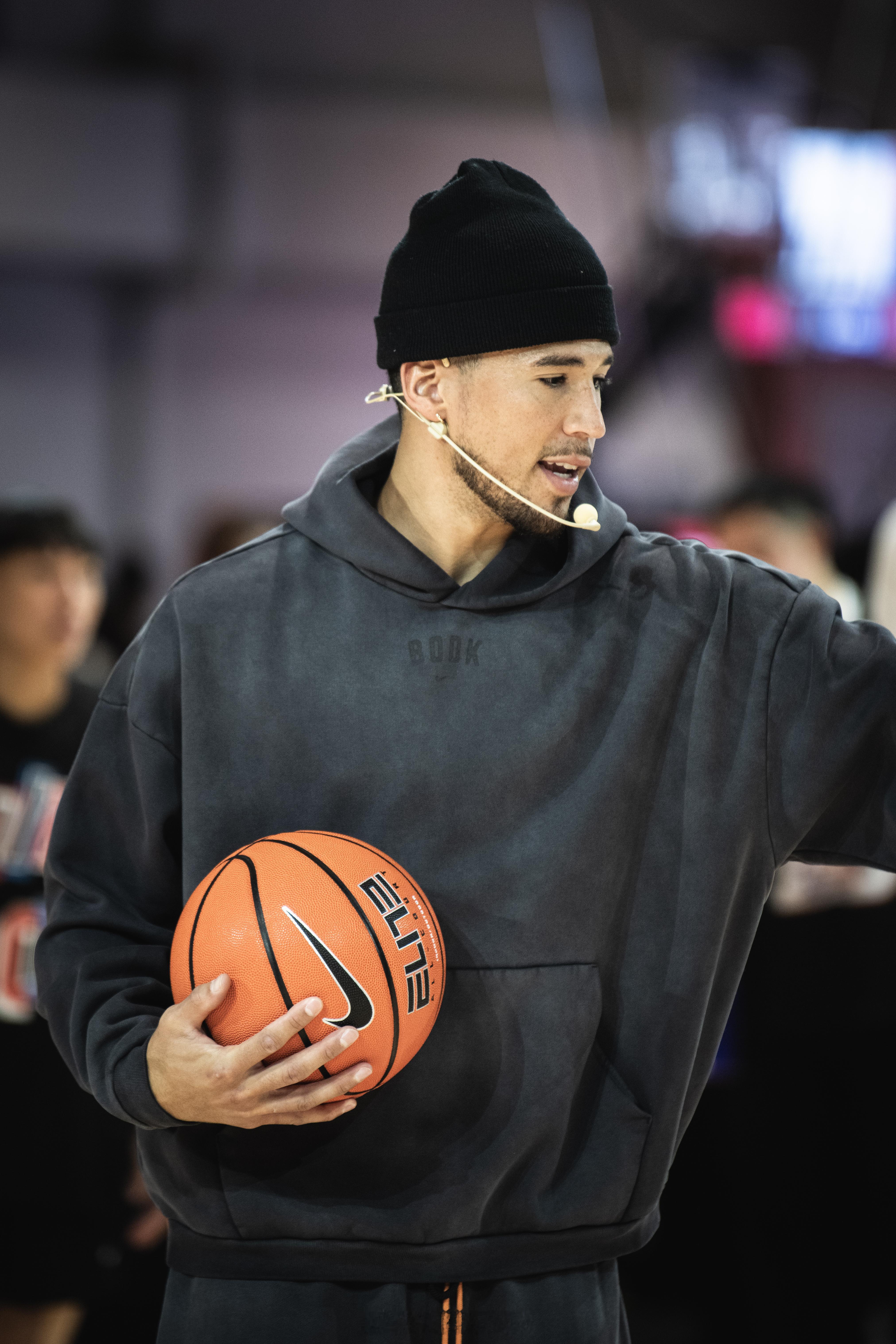 Coach Book[并不简单] 布克在球迷日现身威尼斯人的NBA HOUSE,担任教练传授16-20岁的小球员们进攻&防守技巧,他不仅全情投入,还将自己的签名鞋赠予训练营MOP。