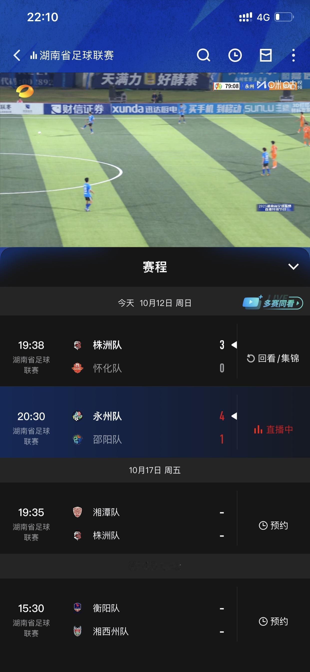 错过了我永州队精彩的4球瞬间啊! 今晚因为有女篮全锦赛看,所以就选择看女篮比赛去了,后面看完都忘了今晚还有我永州队的足球比赛[我想静静] 是刷视频刷到直播间,刚好听到直播说永州队又进球了,然后进去看,直接是4:1 而且是55分钟之前完成的4个球 距离结束还有10来分钟,说不定还会进,因为现在双方都没有求稳,而是开大脚的往对方身后打,尤其是邵阳队想找机会扳回一球,尽量少输点!