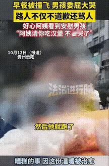 贵州贵阳,男孩的早餐被一男子撞掉了,男孩痛哭着拉住男子想让他赔自己早餐,没想到男子用力将男孩扯开一顿谩骂后头也不回的就离开了。 视频里能清楚看到,穿校服的小男孩手里攥着空了的塑料袋,蹲在地上盯着散落的早餐残骸哭,肩膀一抽一抽的,看着特别让人心疼。 这一幕刚好被旁边卖早餐的阿姨看在眼里。她立马停下手里的活,快步走到男孩身边,先蹲下来拍了拍他的后背,又赶紧递了张纸巾擦眼泪。 听男孩断断续续讲完经过,阿姨立马皱着眉骂了句“这种人太坏了”,然后拉着男孩的手往自己摊位走,边拉边哄:“没事没事,阿姨请你吃汉堡,刚做好的还热乎呢,可不能饿着肚子上学呀”。 视频最后,阿姨把包装好的汉堡塞到男孩手里,看着他擦干眼泪才放心地回到摊位忙活。 一个是撞了人还耍横,把情绪撒在孩子身上;一个是素不相识,却愿意用一个汉堡暖化孩子的委屈。有时候孩子在意的根本不是一顿早餐,是自己的委屈能被看见。 那男的大概忘了,自己也该有过为一点小事难过的年纪,而阿姨的举动,才是给孩子上了最生动的一课——不是所有人都冷漠,总有人会悄悄给你递颗糖。