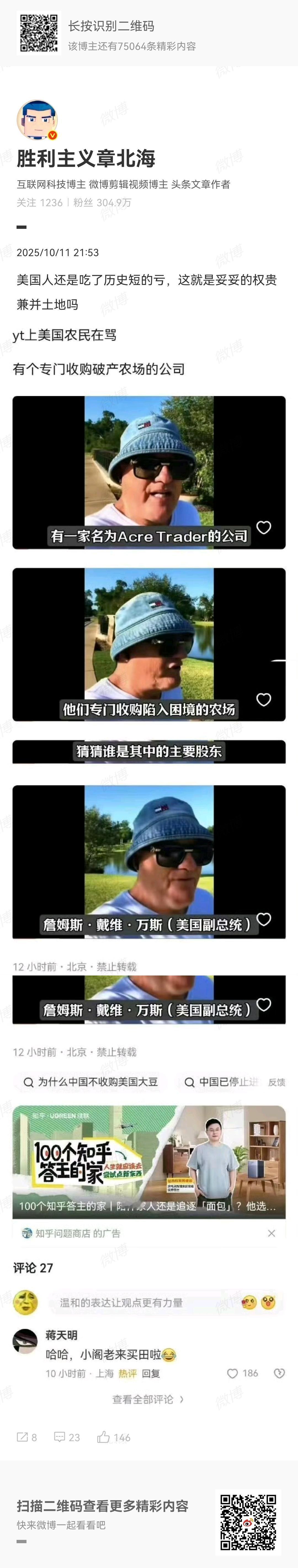 微博大V“胜利主义章北海”近日爆料,现在有一个美国公司正在收购美国破产农民的农场,而其主要股东就是副总统JD·万斯。 现在这件事情已经在油管火了,美国人看到这个都很震惊,完全没有想到,万斯口口声声支持农民,以“乡下人”自居,但位高权重之后,却第一个背刺自己的支持者,想着法子坑人。 也难怪特朗普团队并不在乎美国农民,一番骚操作让中国不再购买美国农民的玉米大豆,原来真实目的竟然是这个,通过搞垮美国农民的大订单,让美国农场破产,他们则趁机低价收购,从中大赚特赚。