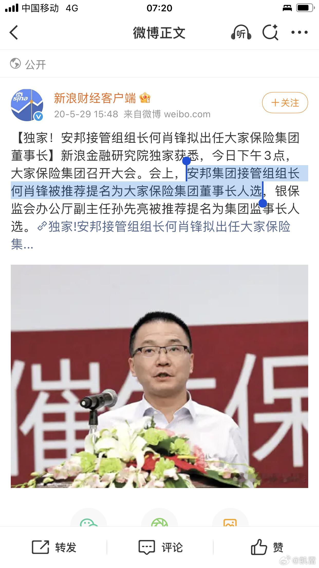 安邦集团接管组组长何肖锋出任大家保险集团董事长五周年