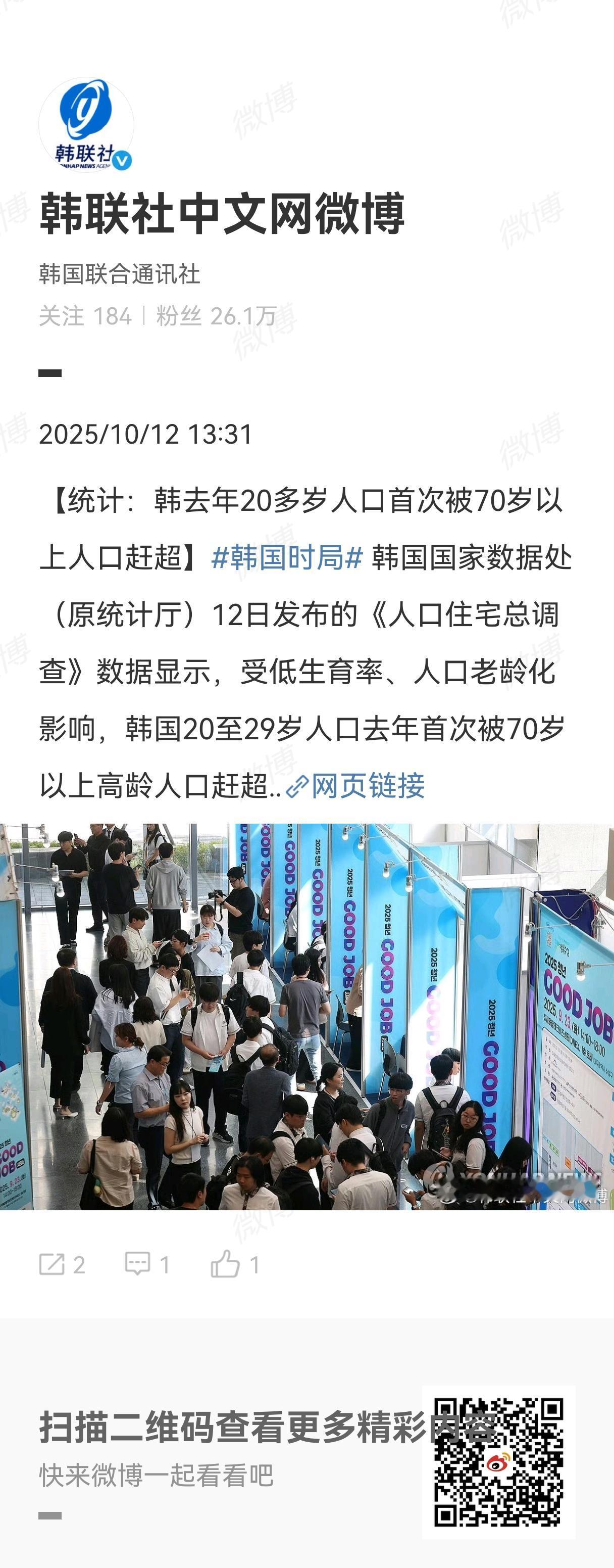 据韩国媒体10月12日报道,韩国20至29岁人口去年首次被70岁以上高龄人口赶超。看老龄化问题已经是个世界大问题,而且会随着科技的进步,这个问题会越来越成为常态化,以后四世同堂的现象很常见,甚至五世同堂都不少见。我决定退休以后开创第二事业,迎接这个时代。