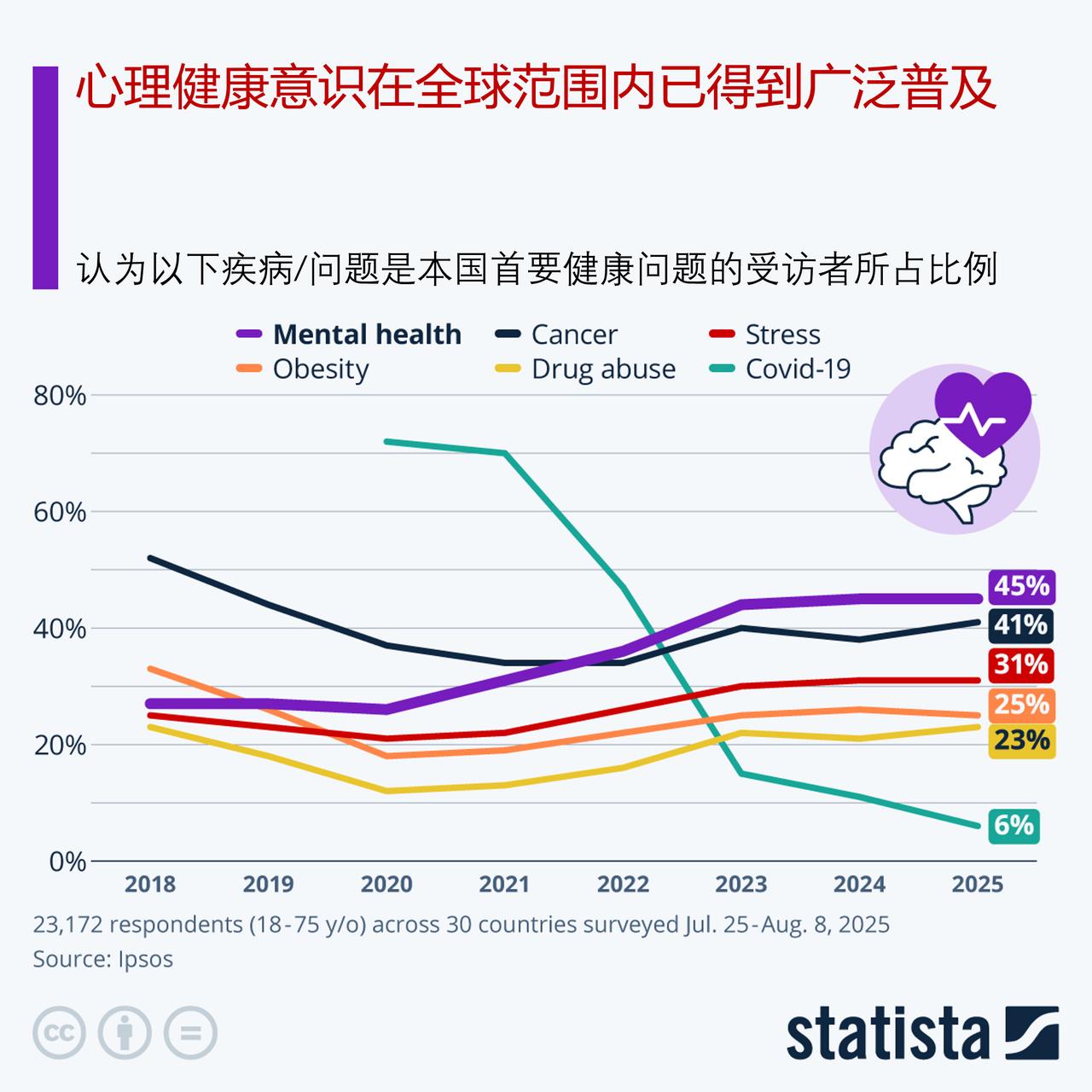 民意调查表明,心理健康意识在全球范围内已得到广泛普及 心理健康仍是全球范围内最为关注的健康问题,其重要性甚至超过了癌症、肥胖症和心脏病。这一结论来自伊索普斯公司在 2025 年 7 月 25 日至 8 月 8 日期间对 30 个国家进行的一项最新调查。 自新冠疫情以来,人们对心理健康的认识有了显著提升。2020 年,仅有 27%的受访者将心理健康视为本国最紧迫的健康问题。而到了 2024 年和 2025 年,这一比例已上升至 45%。尽管 2020 年新冠疫情无疑被视作全球最大的健康问题,有 72%的受访者提及此事,但对这种呼吸系统疾病的担忧已大幅下降,仅有 6%的人将其列为首要健康问题。 然而,各国对此的看法有所不同。在所调查的 30 个国家中,有 18 个国家将心理健康列为医疗保健的首要优先事项。对心理健康问题的关注程度最高的国家分别是智利(68%)、瑞典(63%)、西班牙(62%)、澳大利亚(62%)和加拿大(59%)。美国也属于这一群体,有 50%的受访者将心理健康列为该国的首要问题。而对心理健康问题关注度较低的国家包括日本(25%)、罗马尼亚(21%)和印度(20%)。 在九个国家中,癌症被视为首要的健康问题,这些国家包括法国(60%)、比利时(60%)、印度(52%)和日本(39%)。墨西哥是唯一一个将肥胖列为首要健康问题的国家(58%),而南非则是唯一一个将药物滥用列为首要问题的国家(54%)。 伊普索健康服务报告(2025版)还揭示了代际差异。年轻人更倾向于将心理健康视为首要关注事项:平均而言,16 至 29 岁人群中有 48%将其列为本国的首要健康问题,而 70 至 74 岁年龄段的成年人中这一比例为 35%。这可能反映出年轻人正面临尤为严峻的挑战,同时也反映了不同代际在心理健康方面的认知程度和污名化程度存在差异。