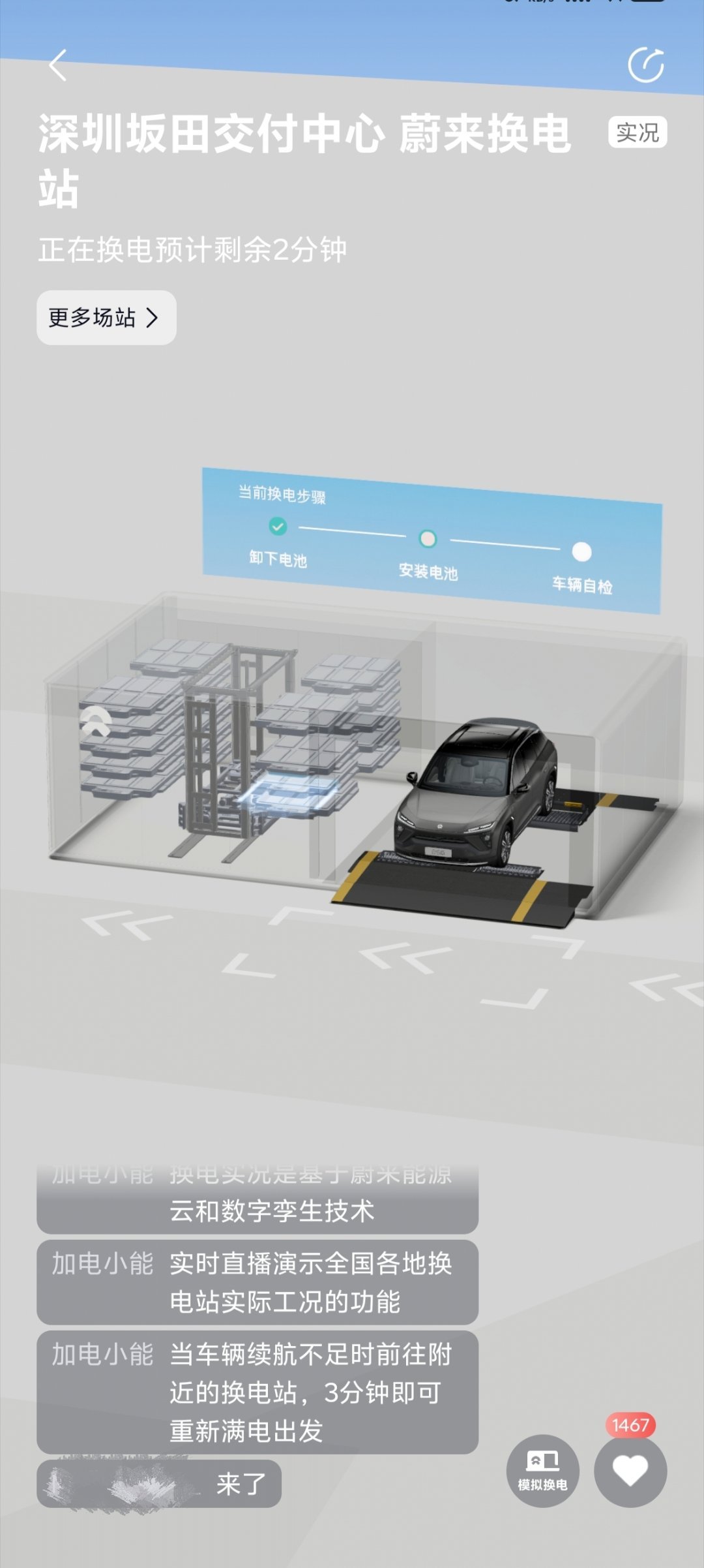 最近又发现,蔚来APP里还能看到换电站的实况直播,进行到哪一步都能看见,甚至车辆模型也完全对得上现实。刚才闲着看了好一会,太好玩了!