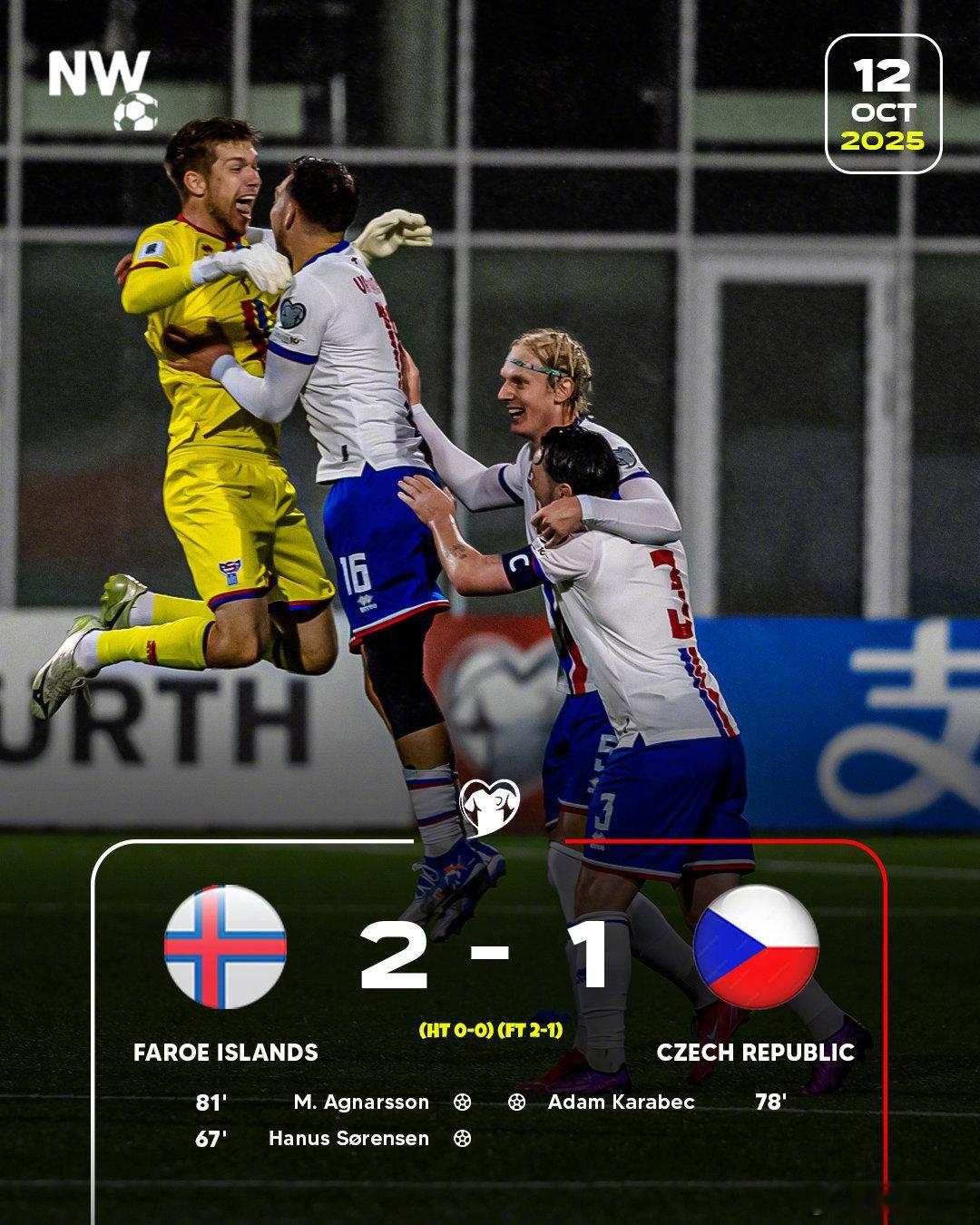 【出线还有希望】世界排名第136位的法罗群岛在世预赛2比1击败排名高出97位的捷克,取得了3连胜,而上一场他们在世预赛4比0击败了黑山,追平了队史最大比分赢球纪录。