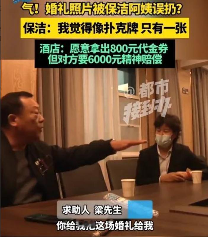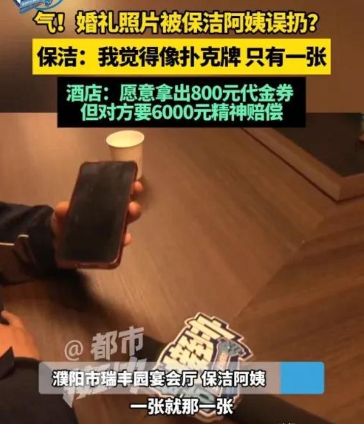 河南濮阳,一名男子的儿子在酒店举行婚礼,没想到用拍立得拍的照片被保洁当成扑克牌丢掉,男子声称丢了40张,向酒店索要6000元赔偿。酒店认为男子没有提前告知贵重财物,并且保洁说只丢了一张,只愿意赔偿800元的购物劵,调解陷入僵局。 都市报道10 月10号报道,河南濮阳的梁先生一家原本沉浸在儿子结婚的喜悦里,可一场突如其来的意外,让这份喜悦蒙上了一层阴影。 为了给孩子们留下一段难忘的回忆,梁先生特意在当地一家酒店为儿子操办了婚礼,前前后后花了一万三千多块钱。 婚礼当天,酒店还免费给新娘提供了一间化妆间,供她整理妆容和放置随身物品,谁都没料到,就是这个临时使用的空间,会成为后续争议的起点。 敬酒时,新娘跟随新郎逐桌向宾客表达感谢,化妆间暂时空了出来。 待她返回化妆间,准备将原本放在桌上的拍立得照片收进相册时,却发现不见了踪影。 这些照片里,有她与奶奶的温馨合影,也有和许久未见的老师、同学的笑脸,每张刚打印出的照片都还带着温热的触感。 她立刻叫来家人一同寻找,化妆台的抽屉、椅子下方,甚至连房间内的垃圾桶都翻找了一遍,却始终没看到那些照片的痕迹。 梁先生见状急得不停搓手,一边让儿子去联系酒店工作人员询问情况,一边在化妆间里来回踱步,口中念叨着近四十张记录婚礼珍贵瞬间的照片就这样莫名消失,满心焦急与不解。 酒店方面也配合着一起寻找,工作人员陪着梁先生一家跑了好几个垃圾站,在一堆堆垃圾里仔细翻找,可最终还是一无所获。 眼看着照片找不回来了,梁先生一家又气又急,他们想不明白,好好放在化妆间的东西,怎么会平白无故消失。 梁先生认为自家花费高额费用办婚礼,图的就是一场圆满,如今承载回忆的照片丢失,他质疑酒店工作人员在打扫时,为何不先确认这些物品是否需要保留再进行清理。 保洁阿姨被找到时,听到关于照片的询问,她先是愣了一下,随后回忆起自己刚才进入化妆间打扫时,看到桌上有个类似扑克牌的物品,以为是客人用完丢弃的,便顺手收走扔掉了。 可当梁先生提到丢失近四十张照片时,保洁阿姨连忙摆手否认,称自己只扔了一张,若是一沓照片,她肯定会先询问客人,不会随意丢弃。 这番话让梁先生一家更加着急,他们翻出新娘手机里的网购记录,显示拍立得相纸购买了四十张,但保洁阿姨依旧坚持自己只扔了一张,双方各执一词,始终无法达成一致。 后续谈及赔偿问题时,矛盾变得更加突出。 梁先生认为,照片里的人物有的从外地乘车数小时赶来参加婚礼,这些记录特殊瞬间的照片丢失后,再也无法补回。 因此他想要酒店赔偿六千元作为精神补偿,或者重新举办一场婚礼,将当时的宾客再次邀请回来补拍照片。 但酒店经理却有不同看法,他表示按照常规,客人的贵重物品本应由自己妥善保管,若是梁先生一家提前告知需要保管照片,酒店肯定会多加留意。 如今既没有证据证明照片丢失是酒店工作人员的责任,连丢失照片的准确数量都未能完全确认,酒店愿意提供八百元购物券作为补偿,已经是充分考虑到客人的心情。 在调解过程中,双方的情绪都有些激动。 梁先生指着桌子,认为酒店的做法是不负责任,甚至用 “坏良心” 来形容酒店的态度。 酒店经理也毫不退让,反驳称若是赔偿六千元就算尽到责任,那任何人都能随意提出赔偿要求,在照片数量都未核实清楚的情况下,酒店不会为了维持生意而接受这种不合理的要求。 双方争执了许久,最终还是没能谈出结果。 此事被人发布到网上后,引发了网友们的讨论。 有网友认为,拍立得照片从外观上看确实与扑克牌相似,保洁阿姨没留意到而丢弃也在情理之中,酒店提出的八百元购物券补偿方案比较合理,不能仅凭客人单方面说法就确定赔偿数额。 也有网友觉得梁先生的诉求有些过分,一场花费一万三千元的婚礼,仅因照片丢失就要求六千元赔偿,金额过高。 直到现在,梁先生一家和酒店还没就赔偿问题达成一致,这场因为婚礼照片丢失引发的争议,就这么陷入了僵局,原本该被珍藏的婚礼回忆,也因为这场纠纷,多了几分无奈。
