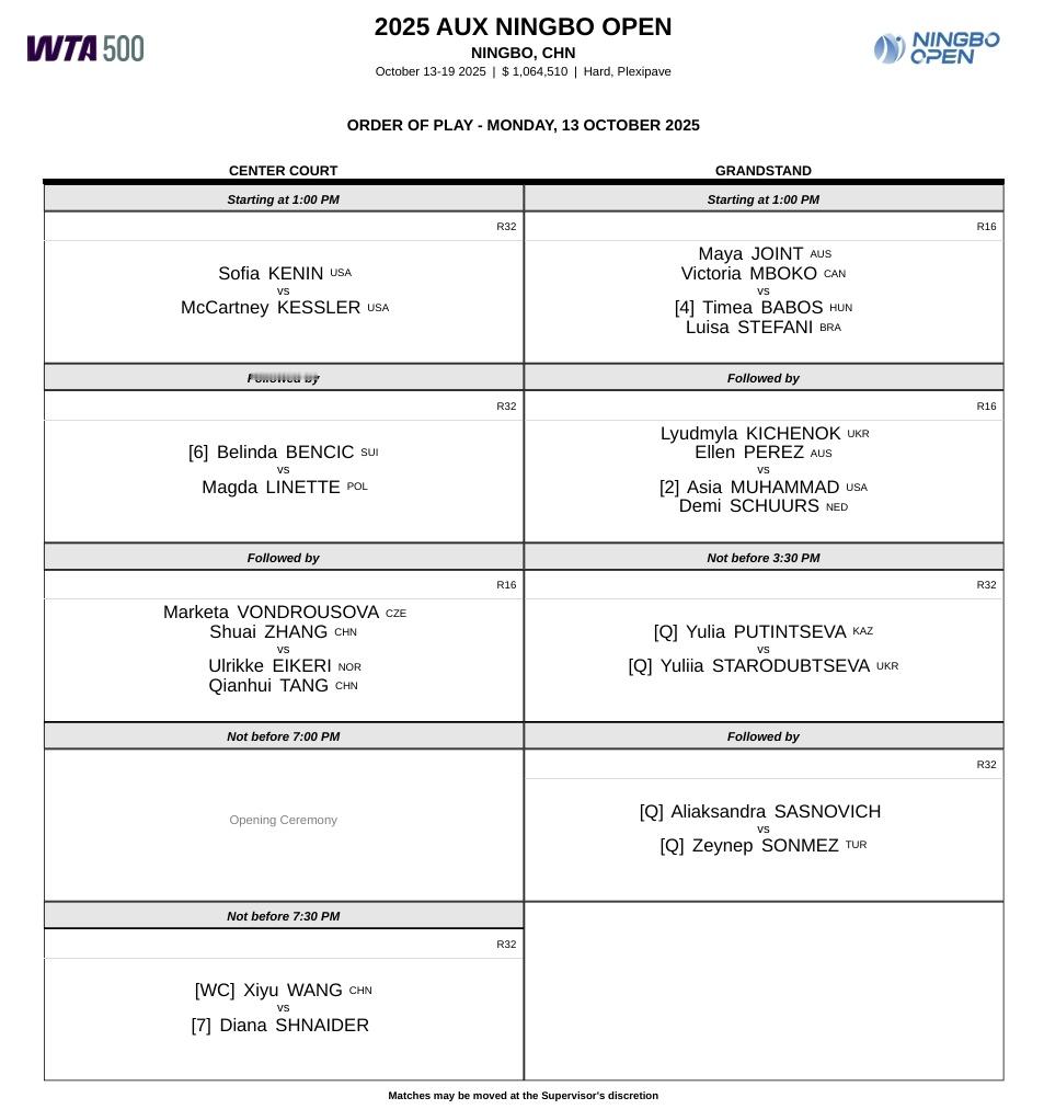 2025奥克斯·宁波网球公开赛今日赛程📅