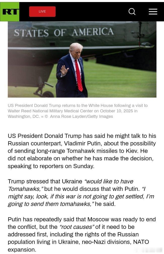 特朗普强调,乌克兰“希望拥有战斧”,但他将与普京讨论这个问题。他说:“我可能会说,看,如果这场战争得不到解决,我就给他们送去战斧。”