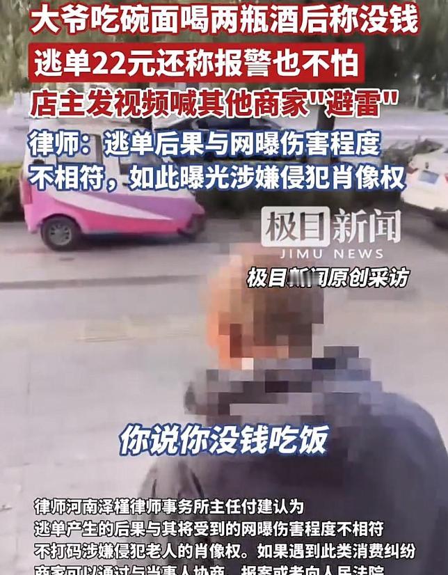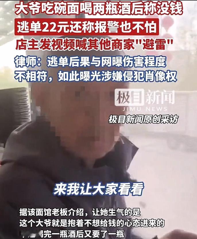 吉林白城,一名面馆老板遭遇“霸王餐”事件,拍下逃单客人的面容曝光,提醒同行注意。有律师发声,老板的视频不打码涉嫌侵犯肖像权,可能引起的网暴和逃单产生的后果不相符,网友怒了。 极目新闻10月11日报道,吉林省白城市一家小面馆里发生的逃单事件,在网上引起了很多讨论。 这天店里来了位大爷,要了一小瓶白酒和一碗面,吃饭中间大爷把第一瓶酒喝完之后又要了一瓶。 等全都吃完喝完,老板算好账说一共22块,没成想大爷直接摆手说没钱。 老板一听就急了,自己开个小面馆,赚的都是起早贪黑的辛苦钱,22块虽然不多,但也是一笔笔攒出来的成本。 可是大爷就是不掏钱,还撂下话“你找警察也没有用”,眼看着店里的客人越来越多,等着老板招待,老板怕跟大爷耗着影响生意,只能让他走。 看着大爷离开的背影,老板又气又委屈,追到店外把大爷拍了下来,之后发到社交账号上,想提醒其他商家注意,别再被这位大爷“坑”了。 没料到的是,这视频发出去后,除了网友替老板抱不平的声音,还有律师站出来说话了。 河南一所律师事务所的主任说,老板拍视频公开大爷肖像的行为有些不妥当,虽说初衷是帮其他商家避坑,但要是没给大爷面部打码,就涉嫌侵犯肖像权。 而且大爷逃单带来的22元损失,跟他可能因为视频遭遇的网暴比起来,根本不是一个量级的,这么做实在不值得,老板应该协商,报案或者向法院提起上诉。 这话一出,不少网友不乐意了,觉得律师是站着说话不腰疼。 有网友说,22块钱对大公司来说不算啥,可对小面馆这种小本生意,就是实实在在的开支,要是人人都像这大爷一样逃单,老板还怎么经营下去? 还有网友替老板委屈,说要是能跟大爷协商好,谁愿意费那劲曝光啊? 再说真要去法院起诉,先不说能不能把22块钱要回来,光来回跑、等开庭的时间和精力,都够老板做多少生意了,这成本也太高了。 大家争论的焦点,说到底就是怎么处理这种“小事”。 一边是老板被逃单后的委屈,想通过曝光提醒同行,一边是法律层面的边界,曝光可能涉嫌侵权。 有人觉得老板没错,就该让逃单的人受点教训,不然以后还会有更多商家遭殃。 也有人觉得法律就是法律,不能因为对方有错,自己就越过红线,要是人人都这么曝光,万一拍错人或者把事情闹大,反而更麻烦。 还有网友分享了自己的经历,说之前遇到过逃单的,没跟对方吵也没曝光,直接报了警,警方联系上逃单的人后,很快就把钱要回来了,既没担风险,也没费多少劲。 遇到这种事,综合低成本又有效的解决办法,就是把证据留好,像店里的监控视频、消费记录都存下来,接着直接报警,让警察帮忙联系对方催款。 可问题是,很多小商家像这位面馆老板一样,要么担心报警没用,要么觉得起诉太麻烦,最后才选了曝光这条路。 对他们来说,时间和精力都是成本,要是维权的成本比损失本身还高,换谁都会犹豫。 这事儿之所以能引起这么多人讨论,就是因为它太贴近普通人的生活了,谁没遇到过类似的“小事”? 大家吵的不只是这22块钱的事,更是在纠结遇到这种两难情况时,到底该怎么选才既不委屈自己,又不触犯法律。