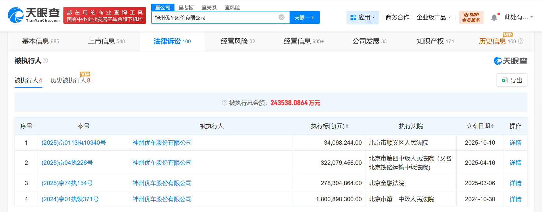 陆正耀及神州优车被执行3409万 天眼查App显示,近日,陆正耀、神州优车股份有限公司新增一则被执行人信息,执行标的3409万余元,涉及保证合同纠纷案件,执行法院为北京市顺义区人民法院。神州优车股份有限公司成立于2002年6月,法定代表人为陆正耀,注册资本约26.86亿人民币,经营范围含网络预约出租汽车经营,软件技术开发、技术服务、技术转让、计算机技术培训、技术咨询,经济信息咨询,企业管理咨询等。天眼风险信息显示,该公司现存4条被执行人信息,被执行总金额超24亿元,此外,该公司还存在多条终本案件及股权冻结信息。