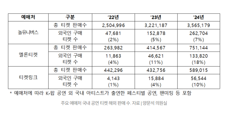 根据韩国共同民主党梁文锡议员从文化体育观光部获取的资料显示,韩国主要票务平台如Interpark、Melon Ticket的海外门票销量从2022年的约6万4千张,飙升至2024年的45万3千张,在三年内暴增7倍以上。这一数据证明了以K-Pop为中心的韩国演出文化正受到全球关注,并转化为实际购买行为。