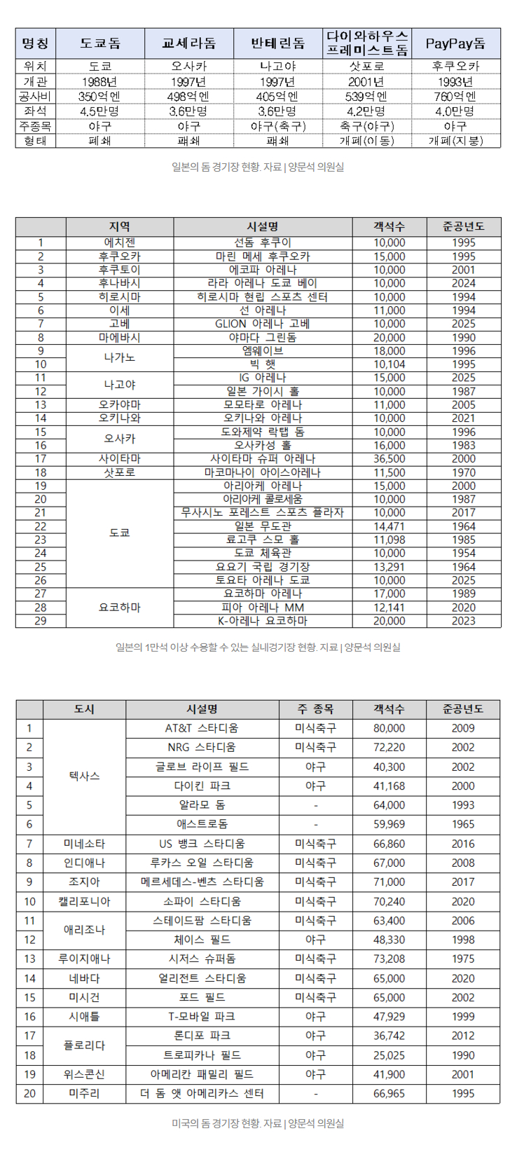 然而,迎接来访韩国海外粉丝的大型演出场地却严重不足。目前,韩国国内能容纳1万人以上的室内演出场地仅有高尺天空巨蛋、KSPO巨蛋等区区5处。相比之下,日本除了包括东京巨蛋在内的五大巨蛋场馆外,能容纳超过1万人的室内场馆多达29处;美国则拥有约20个封闭式巨蛋体育场。