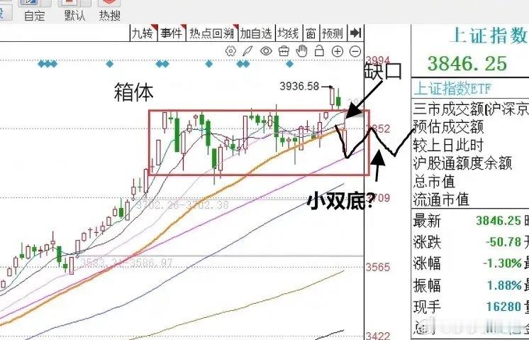 第二,从图二上证指数的角度来分析,我们可以看到上证指数在箱体的右手边出现了一次短线的假突破动作。假突破之后,市场在箱体的右手边又留下了一个跳空缺口。虽然今天市场指数低开在3800点之后立即展开了强劲的反弹,但是如果我们从谨慎的角度来考虑,我们需要看到市场在二次探底的时候能不能出现抛压减小,或者说在3800点附近看到日线级别小双底支撑这种走势。