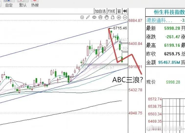 第三,从图三早盘恒生科技指数的走势来看,恒生科技指数早盘反弹之后,出现了非常明显的再次回落的走势。目前恒生科技指数已经来到了9月12号跳空缺口支撑点附近。恒生科技指数短线已经形成比较明显的下行走势。这个走势的情况下,接下来在缺口位置附近可能有反弹的动作,但整体来看,这个反弹有可能只是短线的b浪反弹。