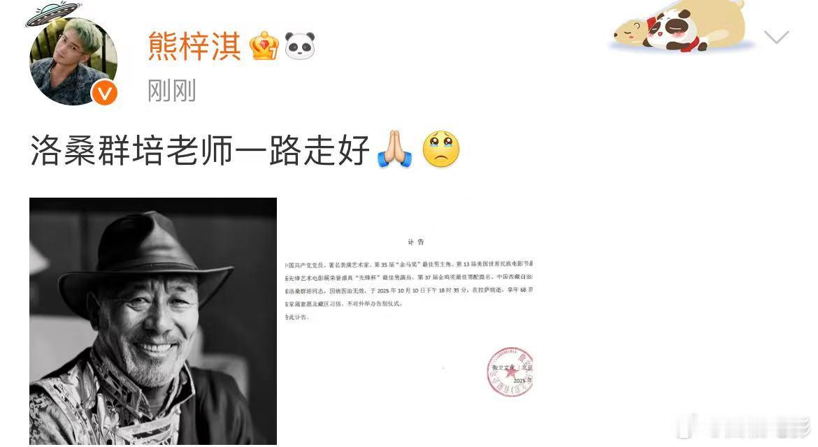 刚刚,熊梓淇发文悼念洛桑群培:“洛桑群培老师一路走好🙏[悲伤]”