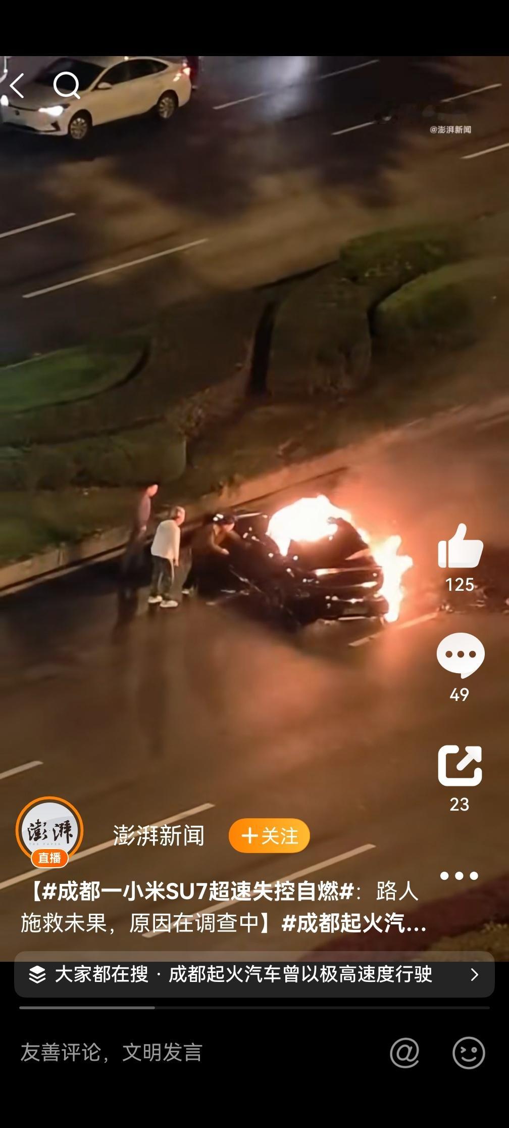 成都天府大道小米自燃 看了很多相关信息和视频,还是挺难受的。目前有些信息说是酒驾超速导致的事故,幸运的是没有伤到其他的车辆和人汽车起火多人救援目击者发声 。目前事故细节并不明朗,待成都交警、消防及小米汽车联合通报后,事实自会明晰。现在能做的就是等待官方调查结果公布,而不是胡乱猜忌、扣帽子、带节奏。