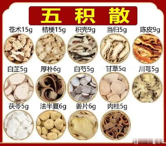 当这些症状同时出现,舌头上还铺着一层白厚腻的苔,那就是五积散大显身手的时候了。它的任务就是:把体表的寒邪发出去,把体内的寒湿化掉,让停滞的气血重新流动起来。