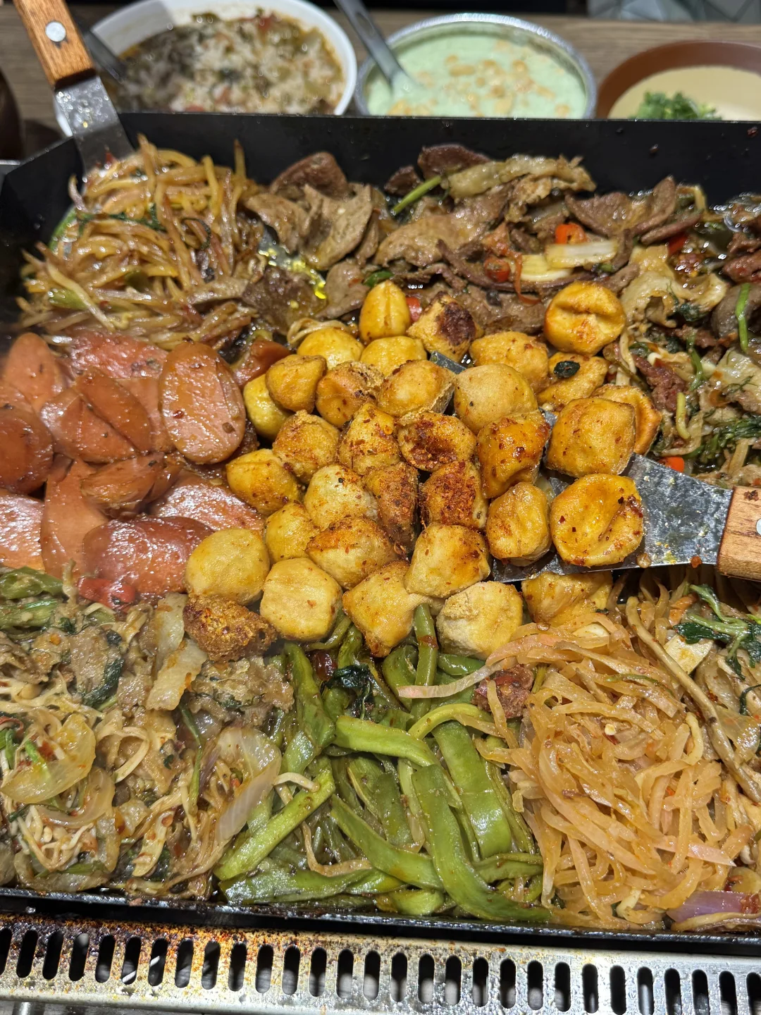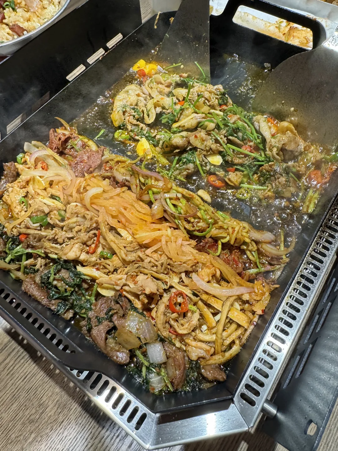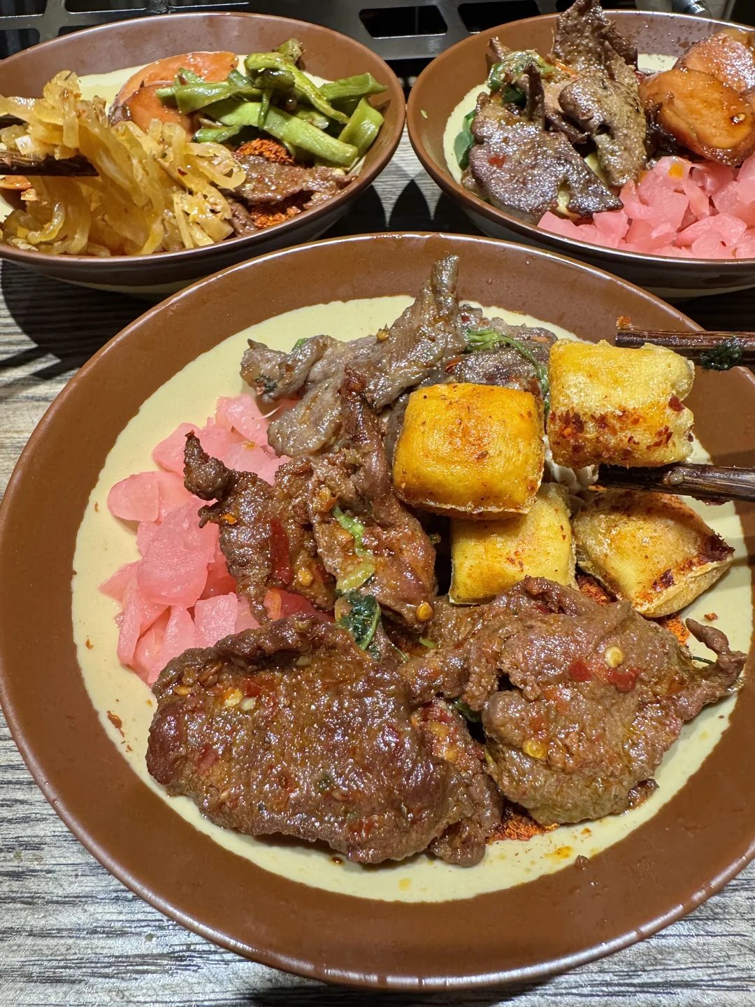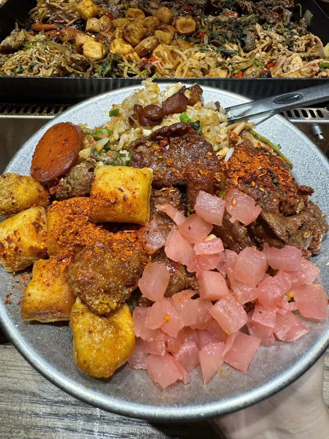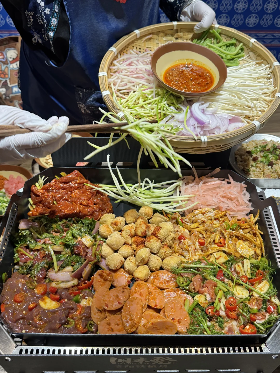 吃过一次真的念念不忘。。。。 一桌桌现炒的,牛肉、小豆腐、火腿肠、猪肝…在铁板上滋拉滋啦的翻炒真的香到不行,好下饭!!! 还有酸菜豆米捞饭、冰浆、脆哨炒饭…每个都吼吼吃😋