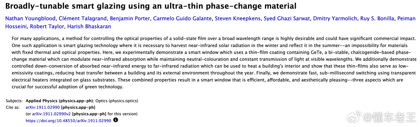 目前的方向有一部分是GeTe、Chalcogenide,但也不全是确实还有VO₂,但VO₂的相变温度通常偏高、寿命、可见光透过受限、制造工艺难度高,能做出产品来的公司,大家可以去看看康奈尔大学19年的这篇论文,你一定会有启发的。 车评精选汽场全开懂车老王