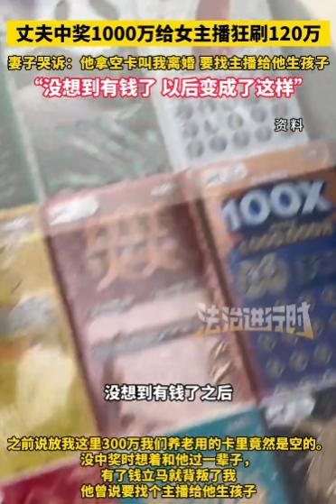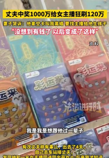 “电视都不敢这么演!”10月10日,山东德州,一男子买彩票中奖1000万,给女主播狂刷120万礼物,还拿着空卡要求妻子离婚,称自己要去找女主播给他生孩子,网友:男人一有钱就变坏啊! 意外之财是否能让一个人本性改变,这是一个颇具争议的话题,很多人认为这些变坏的人本性就是坏,只不过是钱让胆子变大了,展现出了真实的面目。 一男子酷爱买彩票,去年12月17日中了头奖,奖金高达1000多万,钱一拿到手,男子就开启了“挥金如土”模式,他大手一挥,直接给女主播刷了120万元的礼物。 中奖时男子口口声声跟妻子表示,留300万在卡里用作两人的养老金,结果才过去3天这笔钱就被他取了出来,和女主播一起外出旅游,同吃同住。 不仅如此,男子还拿着这张空卡要求发妻离婚,声称自己要去找漂亮的女主播给他生孩子,这让妻子伤心不已,没中奖之前妻子本打算和他过一辈子,没想到男子这一有钱,就背叛妻子自己快活去了。 不少网友认为这就是应了那句老话,男人一有钱就要变坏!其实这话并不准确,本性坏的人一旦条件变好了,自然就会露出自己的真实面目,况且照男子这个花法,估计这笔横财很快就会被他挥霍一空! 信息来源:《丈夫中奖1000万给女主播狂刷120万 妻子哭诉:他拿空卡叫我离婚 要找主播给他生孩子“没想到有钱了 以后变成了这样》法治进行时