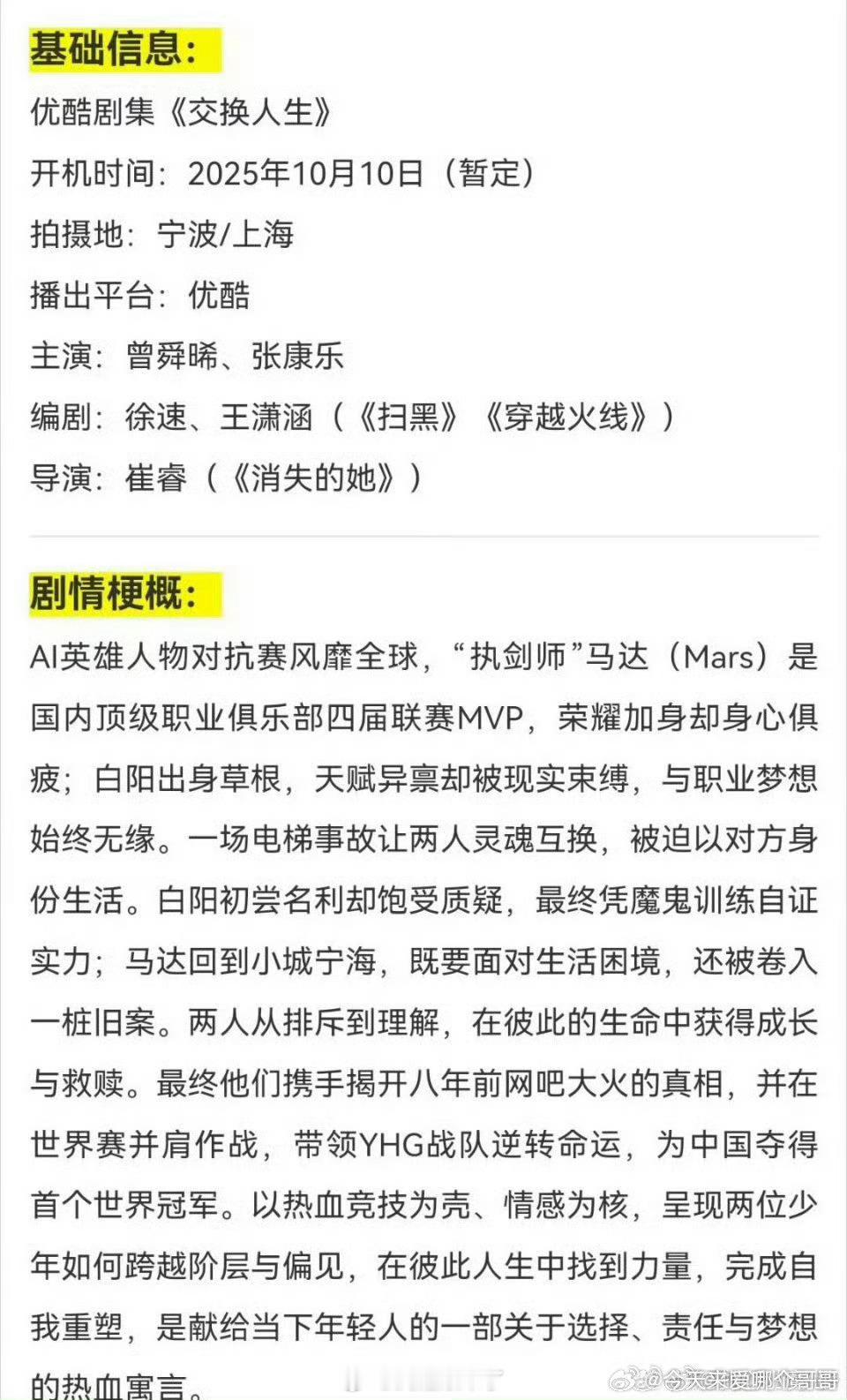 剧集交换人生官博曾舜晞张康乐新剧官博