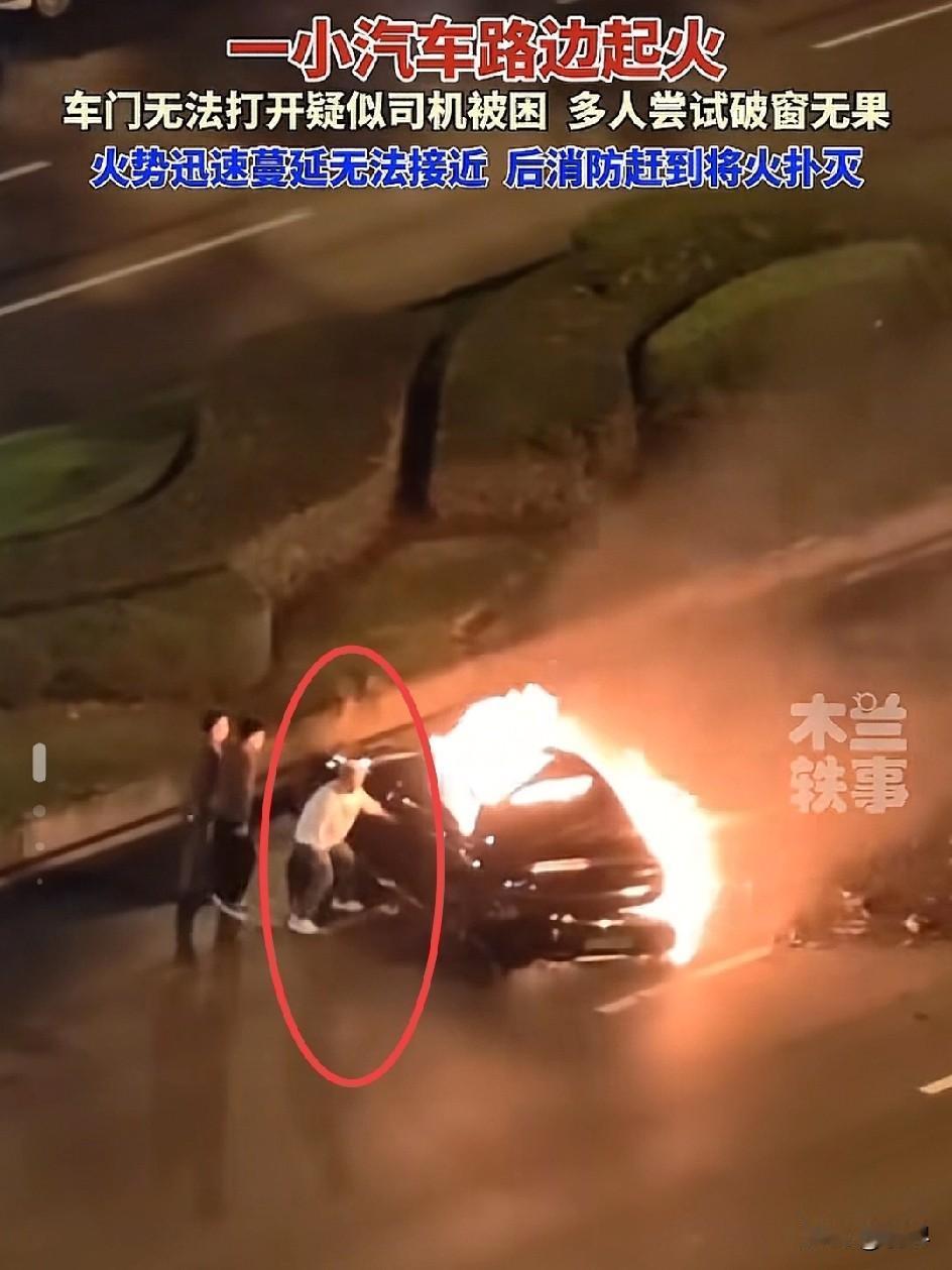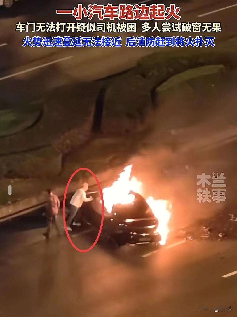 就是这名男子,不顾生命危险,用拳头一次次的狂砸车窗救人,但不幸的是车窗过于结实,始终未能被砸碎,最后只能眼睁睁的看着车内人员被烈火吞噬。 这是一种“见死不能救”,而且是拼了命的在救,却始终无能为力的“无力感”!而这种痛,只有这位救人男子体会最深。 可以看出,这名男子身材非常魁梧,力量也应该很大,打向车窗的每一拳都用足了力气。加上起初着火的车辆,火势也并不大,要是能几拳砸碎车窗,车内人员或许还有一线生机。 但是,随着火势变大,男子手都砸骨折了,车窗也未见破损,旁边几名路人见状,纷纷上前帮忙,有人用脚踹,但也丝毫未不起作用。还没等到旁人寻来找尖锐物品,火势已经窜到主驾一侧。 因为这是电车的缘故,火势窜起来的比较快,众人见状只好后退避险,因为除了要避开这过大的火势外,还得随时预防它发生爆炸。 最后,我要说的是,必须要为这名见义勇为的小伙点赞,当地应该给他颁发见义勇为奖章,虽然人没有救成功,但是这种精神必须要宣扬。 并且,建议大家都在车上配备一个破窗器,不管是自己遇到危险,还是他人遇到危险需要施救的时候,它就能发挥大作用。 对此,大家怎么看?