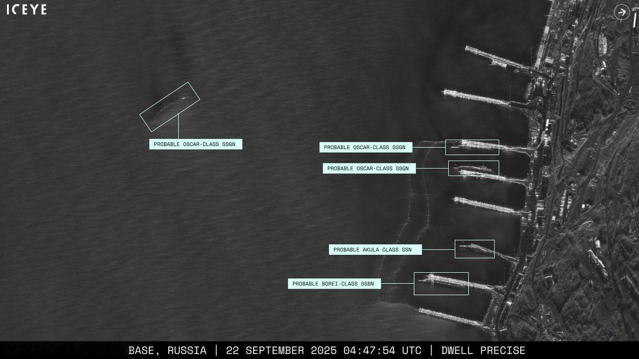 合成孔径雷达卫星拍摄的位于阿瓦查湾的俄罗斯太平洋舰队雷巴奇核潜艇基地