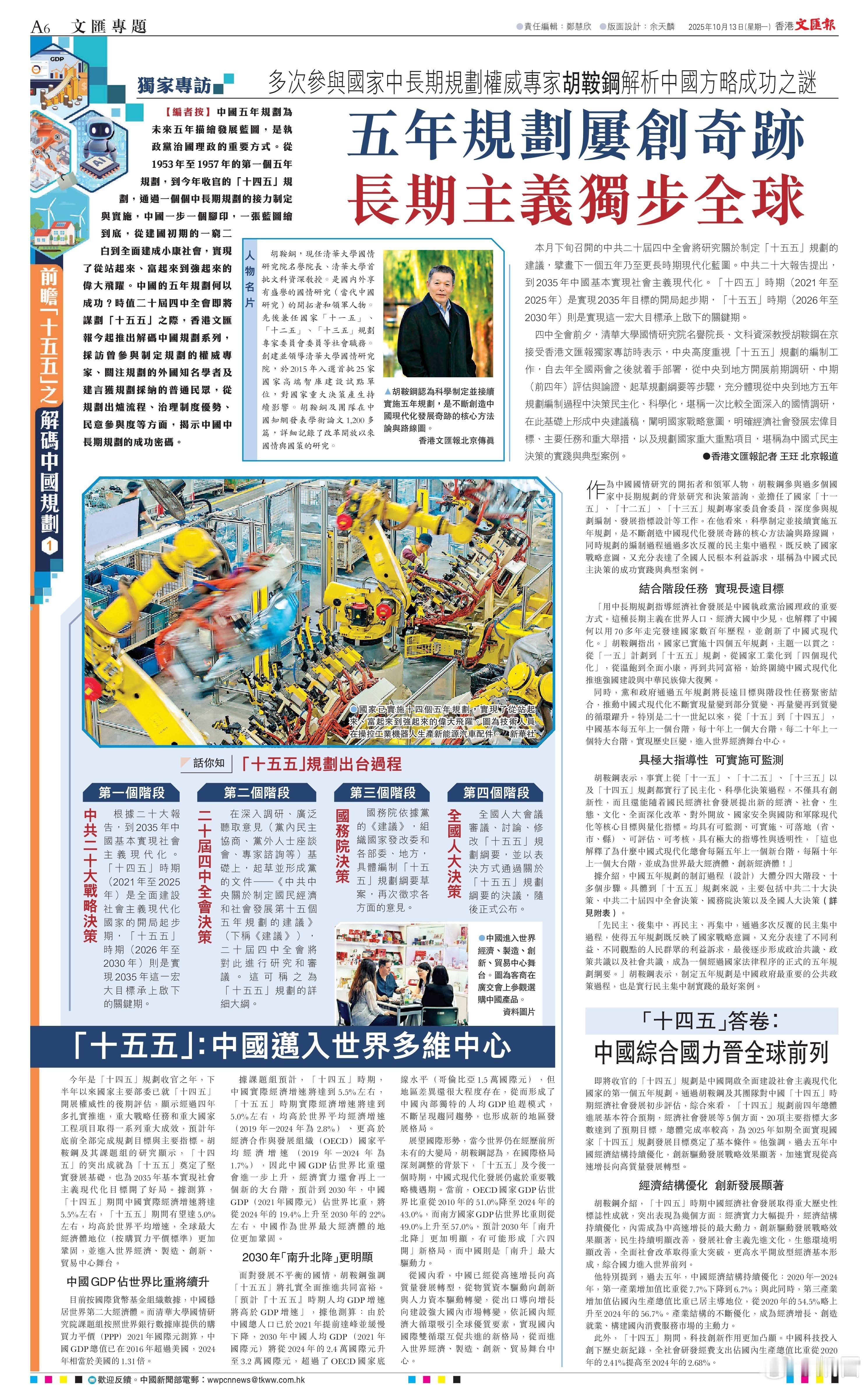 【十五五规划香港文汇报专访】四中全会前夕,清华大学国情研究院名誉院长、文科资深教授胡鞍钢在京接受香港文汇报独家专访时表示,中央高度重视“十五五”规划的编制工作,自去年全国两会之后就着手部署,从中央到地方开展前期调研、中期(前四年)评估与论证、起草规划纲要等步骤,充分体现从中央到地方五年规划编制过程中决策民主化、科学化,堪称一次比较全面深入的国情调研,在此基础上形成中央建议稿,阐明国家战略意图,明确经济社会发展宏伟目标、主要任务和重大举措,以及规划国家重大重点项目,堪称为中国式民主决策的实践与典型案例。