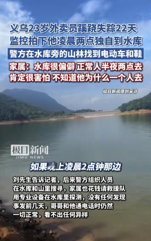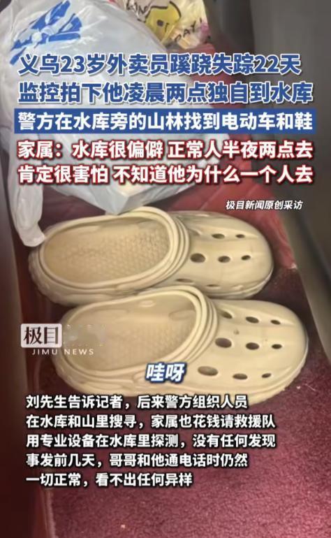 “匪夷所思!”10月12日,浙江义乌,一位23岁外卖员独自外出,突然人间蒸发了22天,家属发现外卖员失踪后,仅仅在一片偏僻水库旁找到了他的电动车和一双拖鞋,更诡异的是,救援队在水库附近用探测仪器寻找,却没有找到他的踪迹!网友:一个大活人还能凭空消失不成? 事情要从9月19日晚上说起,当时据失踪男子的弟弟描述,他哥哥当天送完外卖后正常回到了住处,他和往常一样,脱下了那身标志性的外卖工服,这通常意味着一天工作的结束。 但接下来他的举动却有些不同寻常,之后他没有休息,而是换上了自己的衣服,收拾了一个书包,拿上一把雨伞,随即推门而出。 当时外面正下着雨,家人虽然觉得这么晚还下雨出门有点奇怪,但也没多想,谁也没料到,这一别,竟是音讯全无。 当家人发现他失联后,立刻报了警,随后警方开始展开调查,因为当时没有任何线索,监控录像成了最重要的线索,监控显示,他在9月20日凌晨2点左右,独自一人出现在了义乌一处极为偏僻的水库附近。 监控拍下了他进入水库区域前的最后影像,此后他便彻底从所有公共视野中消失了,这个时间和地点充满了疑团,凌晨两点,一个年轻人为什么要冒着雨去到一个人迹罕至的水库? 那里远离闹市,夜间几乎没有照明,道路也不好走,根据监控线索,家属和警方最终在那片水库旁的树林里找到了他留下的电动车,车就停在那里,旁边还放着一双拖鞋,但人却不见了。 因水库周边地形复杂,植被茂密,水面之下的情况更是难以预料,家属心急如焚,为了尽快找到人,他们不惜自费聘请了专业的民间救援队参与搜救。 救援队带着专业的水下机器人、声纳探测设备等对水库进行了反复、细致的探测,期望能发现一些线索,然而令人失望的是,经过长时间的搜寻,无论是水面还是水下,都没有任何发现。 一个大活人仿佛真的凭空蒸发了,这种“消失”方式确实充满了难以解释的矛盾点,如果是不慎落水,为何探测设备一无所获?如果是自行离开,电动车和拖鞋又该如何解释?尤其是拖鞋的摆放位置和状态,是需要警方仔细勘查的关键物证。 他的弟弟在接受采访时表示,在哥哥失踪前几日,他们通过电话,通话中并未感觉到对方有任何情绪低落或行为异常的迹象,这也让“主动隐匿”的猜测缺乏明显的动机支撑。 一个看似普通的年轻人,在一个不普通的时间,去了一个不普通的地点,然后消失了,这背后究竟发生了什么?是遇到了突发意外,还是有着不为人知的隐情? 这件事也折射出许多在外打工群体的生存状态,这个23岁的年轻人,和许多同龄人一样,选择从事外卖行业,用自己的汗水换取生活。 他们的日常穿梭于城市的脉络之中,看似熟悉每一个角落,但他们的内心世界和可能面临的压力,却常常被忽略,也许一些细微的情绪变化或生活困扰,并未在家人面前表露出来。 目前22天已经过去,搜寻工作想必仍在继续,但难度越来越大,时间每过去一天,家人的焦虑和痛苦就增加一分,他们最需要的,是一个确切的答案。 这个事件也提醒我们,夜间出行,尤其是前往偏僻地带,务必需要提高安全意识,希望警方能早日查明真相,无论是怎样的结果,对家人而言都是一种交代,但愿有奇迹发生,这个年轻的生命能够平安归来。 对于这件事情,大家有什么看法? 信息来源:《义乌23岁外卖小哥蹊跷失踪22天:凌晨两点独自到一处水库,现场只找到电动车和鞋》极目新闻