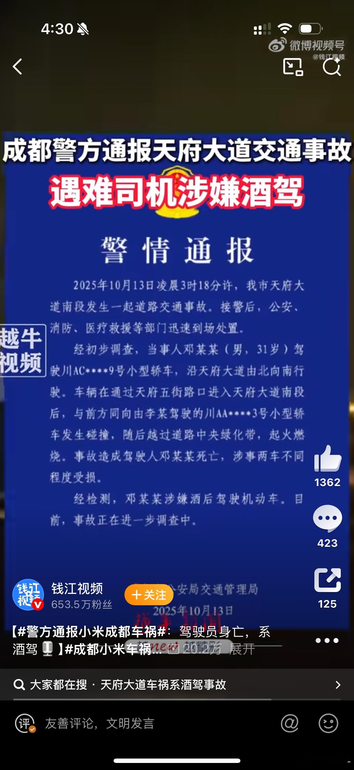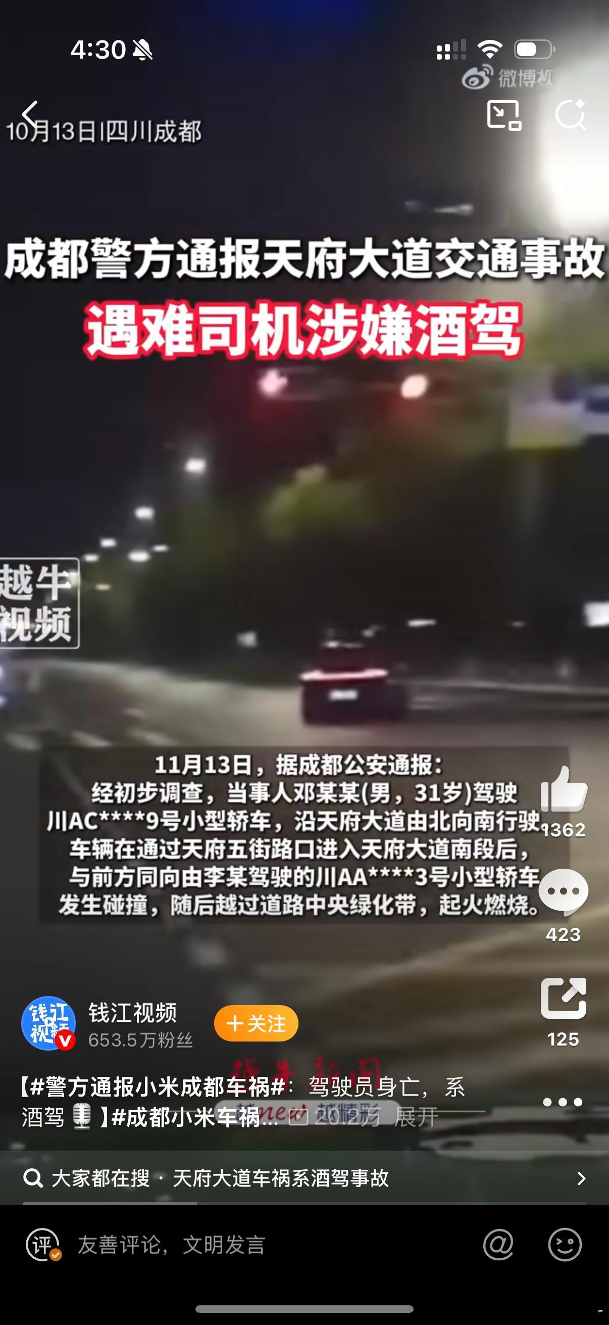 警方通报小米成都车祸成都天府大道小米自燃成都 小米