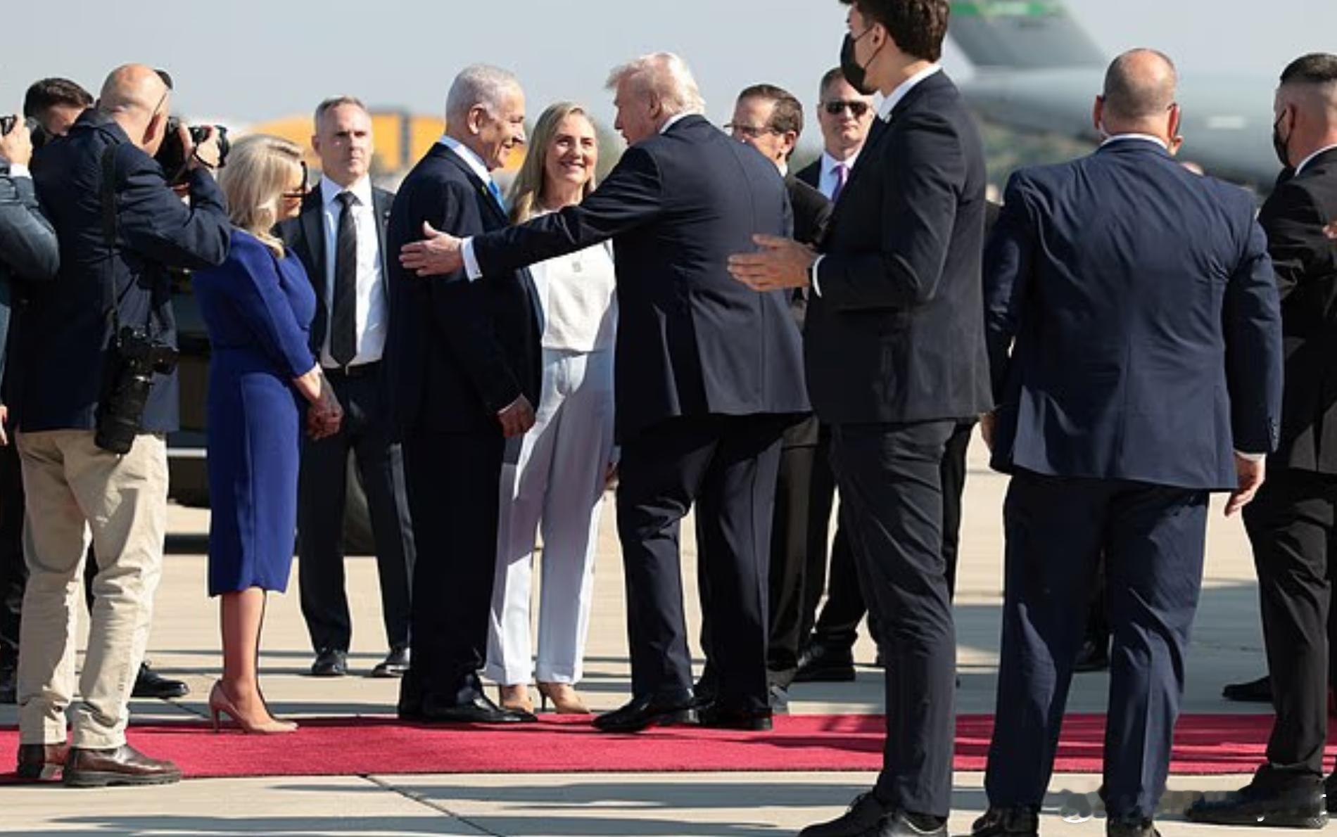 美国总统特朗普乘“空军一号”抵达特拉维夫后,受到以色列总理内塔尼亚胡的迎接。他将在以色列议会(克内塞特)发表演讲,随后前往埃及,与多国领导人共同出席和平峰会。