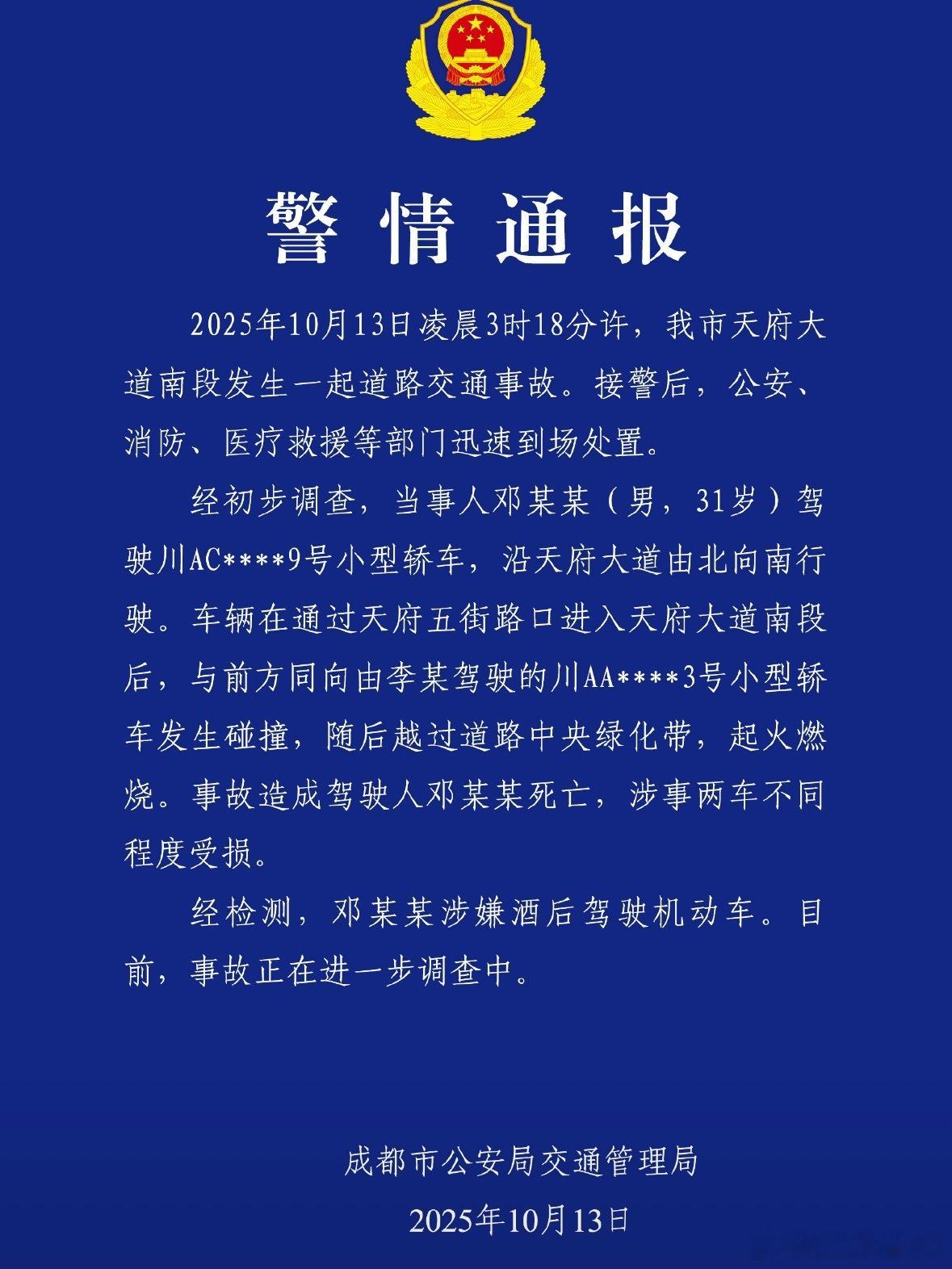 天府大道车祸系酒驾事故警方这不出公告了,这人不光酒驾,还超速得离谱,车速直接干到214,就算撞上去的时候,都还有168的速度![晕]