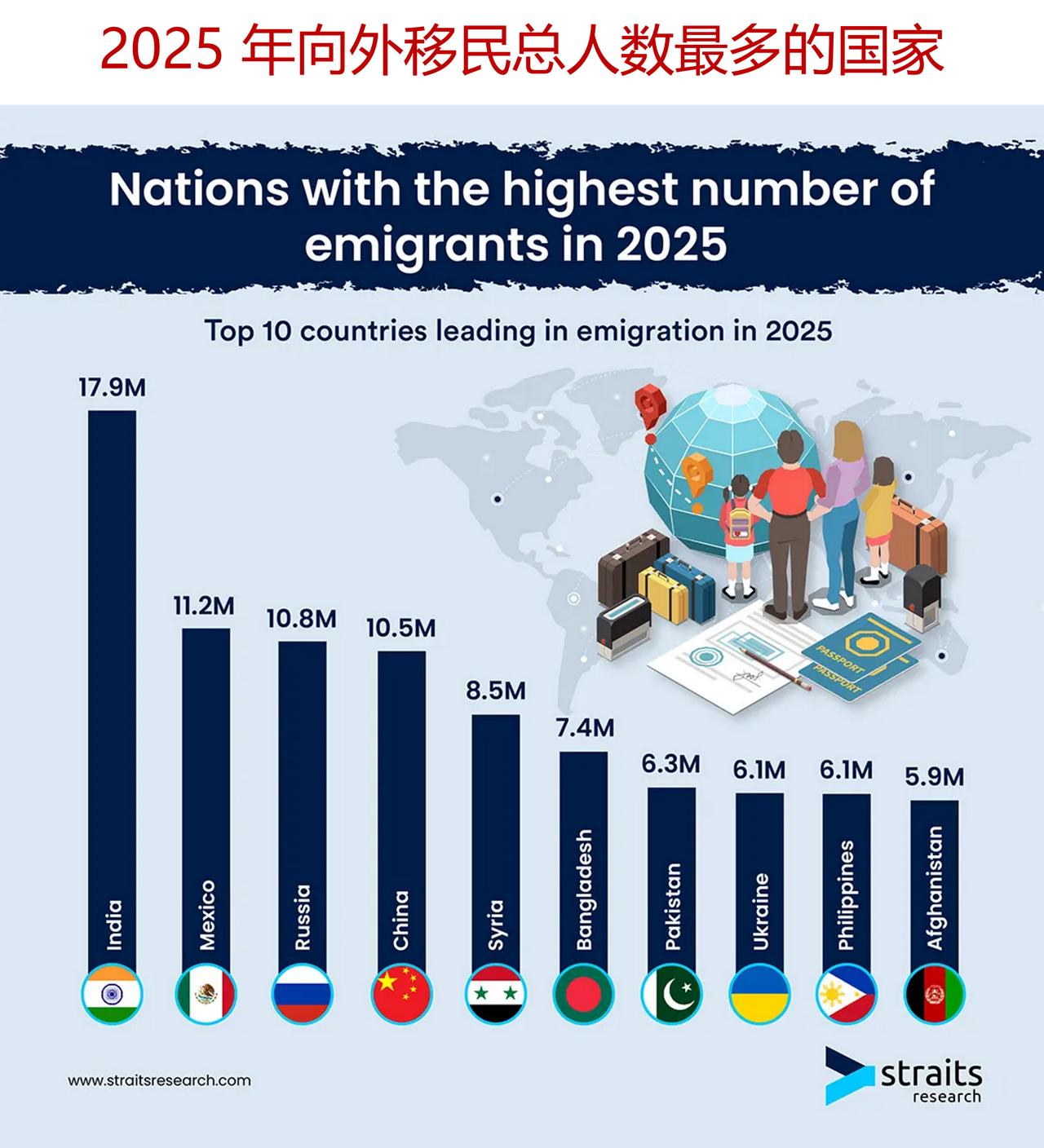 是什么因素推动了移民?向外移民最多的国家是哪些? 移民不仅仅是人口结构的变化;它还是一种强大的力量,对全球的经济、企业以及消费者行为产生着深远影响。根据联合国经济和社会事务部《2024 年国际移民存量报告》,到 2025 年,生活在出生国以外的人口数量预计将达到 3.04 亿,占全球人口的 3.7%。移民不仅改变了劳动力市场和人口动态,还通过汇款和跨境消费为金融领域注入了活力。 ——推动移民的因素 1)不稳定经济 经济因素是导致人口外流的主要原因,因为人们为了寻找薪酬更高的工作和改善生活条件而离开自己的祖国。在新西兰,截至 2025 年 6 月,有 71800 名公民离开了该国,这是 13 年来最高的移民率。这种大规模的外流是由经济困境所驱动的,由于政策频繁变动,其中 38%的离开者年龄在 30 岁以下。 高失业率、低工资以及经济不平等进一步促使人们迁移,而通货膨胀、货币不稳定以及总体经济的不确定性使得留在原地变得不再可行。在土耳其,其经济在 2024 年第三季度出现了衰退,通货膨胀率从 2024 年 5 月的峰值 75.5%下降至 11 月的 47.1%。 尽管如此,经济的不确定性以及政策方面的挑战促使许多民众考虑移民以寻求更稳定的经济状况。这些移民潮对市场有着直接的影响,因为移民带来的汇款资金会增加其原籍国对金融服务、房地产和消费品的需求。 2)政治动荡 政治不稳定、冲突以及人身安全受到威胁是导致人口外流的主要原因。民众往往会离开那些饱受腐败、制度薄弱或独裁统治困扰的国家,而战争、社会动荡以及诸如叙利亚、阿富汗和乌克兰等地的地区冲突则迫使许多人寻求国外的避难所。 在巴勒斯坦,持续的以色列与哈马斯之间的战争导致了大规模的人员流离失所和迁移。在约旦河西岸和东耶路撒冷,政治不稳定局势导致了人口外流现象加剧。 加沙约 90% 的人口已流离失所,许多人前往其他国家寻求避难。2025 年,这些地区的巴勒斯坦人中有创纪录的 43% 无法负担食物费用,这一比例较 2024 年的 33% 显著上升。这表明迫害、种族冲突以及人权侵犯迫使人们迁移,以寻求安全与稳定。 ——社会和人口方面的因素 家庭团聚仍是人们迁移的主要原因。在“移民治理指数”(MGI)所涵盖的国家中,约有 42% 的国家对所有移民都允许家庭团聚政策,而 53% 的国家则对部分外国居民允许该政策。这一政策有助于个人前往国外与家人团聚,从而对总体移民人数产生了影响。 海外教育也对此起到了推动作用。据联合国教科文组织称,2025 年全球接受高等教育的学生人数达到了创纪录的 2.64 亿,较 2020 年增加了 2500 万,是 2000 年总人数的两倍多。 在美国,尽管面临政策方面的挑战,但对美国高等教育的需求依然强劲。在 2025 年 7 月底对 300 名外国出生的学生进行的一项调查发现,91%的学生计划在美国学习,其中 99%的学生表示信任美国院校的教育质量。 ——2025 年向外移民人数最多的重要国家 到 2025 年,印度成为全球移民输出最多的国家,有 1790 万公民定居海外;紧随其后的是墨西哥,有 1120 万移民;俄罗斯有 1080 万移民。中国紧随其后,有 1050 万移民;叙利亚以 850 万移民的数量位居第五,这反映出因冲突而产生的持续移民现象。 此外,还有大量移民来自孟加拉国(740 万)、巴基斯坦(630 万)和乌克兰(610 万),其中乌克兰的移民人数受到地区不稳定局势的影响。菲律宾的移民人数与乌克兰相同,均为 610 万,而阿富汗以 590 万的移民人数排名第十,这凸显了经济、社会和冲突相关的移民模式共同作用,从而影响着全球人口流动的情况。 ——结 语 2025 年的移民潮正在对跨越国界的各个经济体产生深远影响,促进金融科技的发展,并在原籍国和目的地国都对消费者需求产生影响。对于全球市场而言,这意味着在各个领域出现由移民群体驱动的新机遇。对于企业和投资者而言,人员的流动意味着数十亿美元的经济活动以及等待被探索的全新市场。