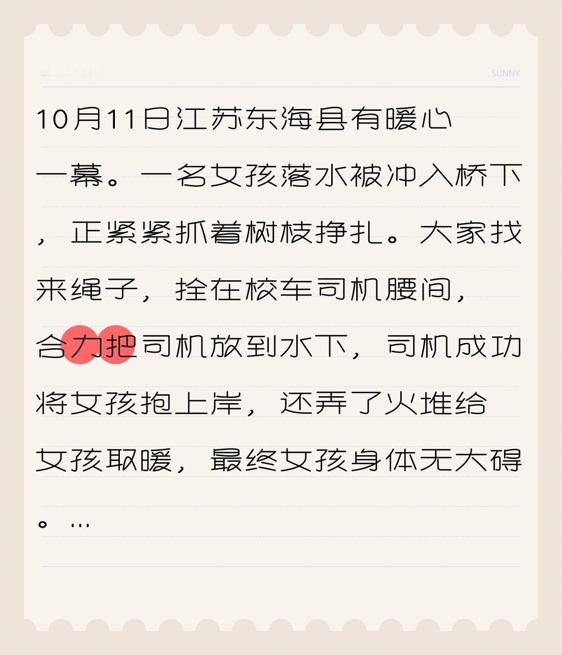 10月11日江苏东海县有暖心一幕。一名女孩落水被冲入桥下,正紧紧抓着树枝挣扎。大家找来绳子,拴在校车司机腰间,合力把司机放到水下,司机成功将女孩抱上岸,还弄了火堆给女孩取暖,最终女孩身体无大碍。 无独有偶,9月27日海南五指山也有女孩被激流冲走,紧紧抓住河中树枝。好在消防、公安人员及时救援,女孩成功上岸。 这些救援事件让人暖心又后怕。正值台风和汛期,河道危险,家长一定要看好孩子,加强安全教育,别让类似的惊险再上演。
