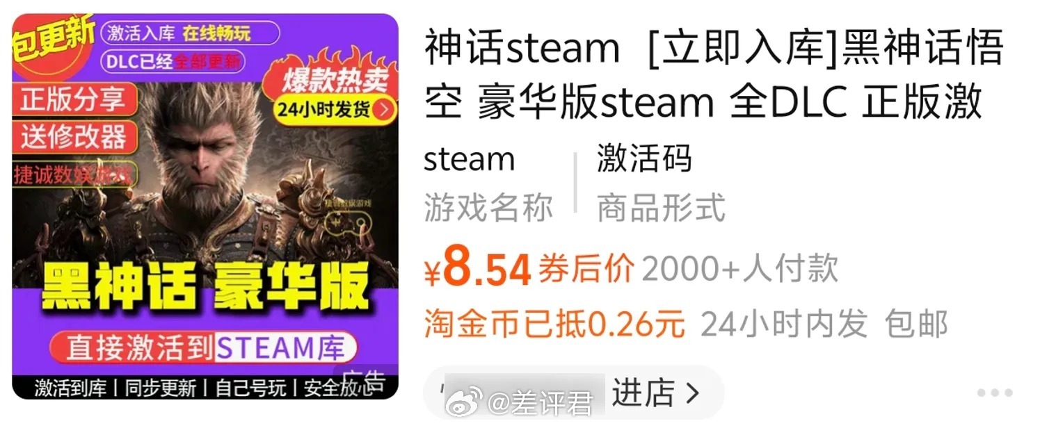 #8块钱买黑神话# 一到假期不少朋友就赶紧玩玩游戏,于是就有人灵机一动,去了某宝等电商平台,找找有没有便宜路子。结果定眼一看,好家伙,Steam的CD Key居然这么便宜。原价两三百的2077现在不到10块钱,还带往日之影DLC;黑神话也是只需8块多,一看销量2000+。跟着店家一通操作,虽然有点繁琐,可游戏成功入了库,也能进游戏正常游玩。