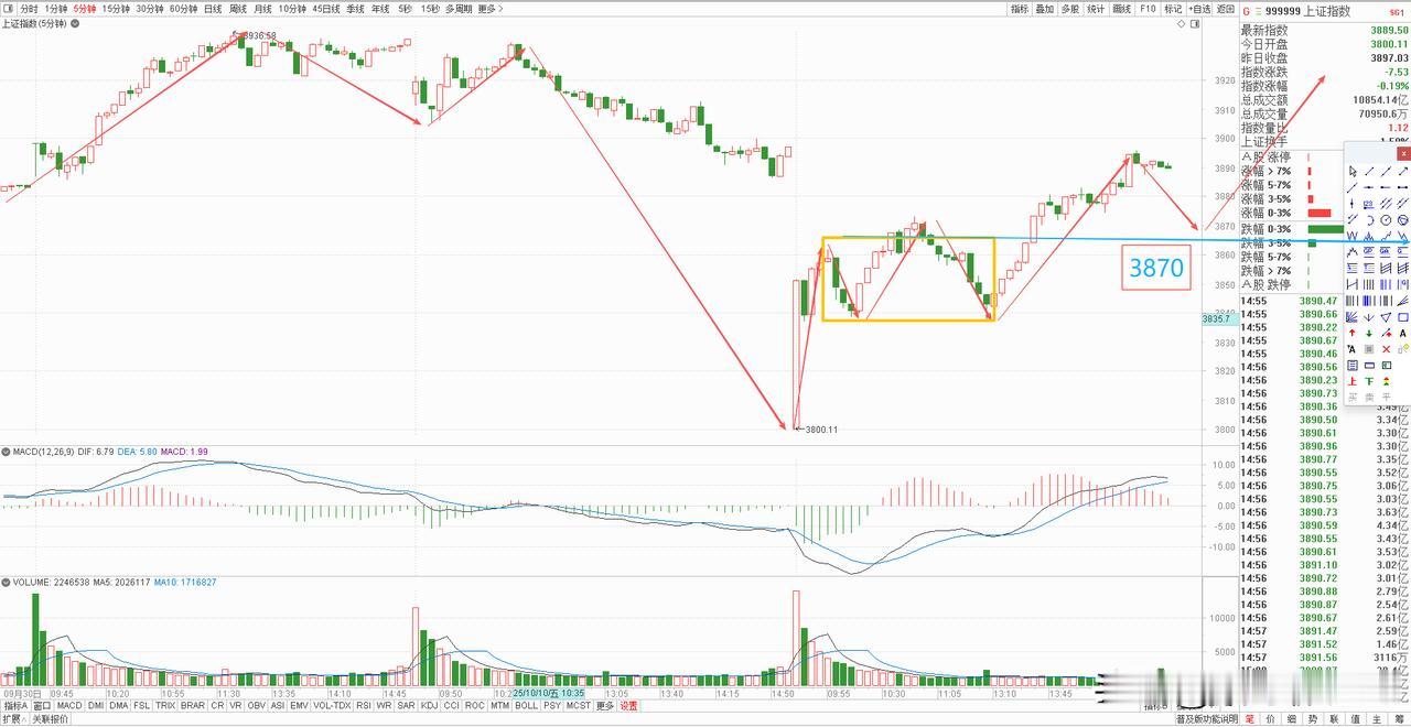 大盘今天低开高走,收了一根缩量假阳线,早盘受外围影响做了一个大幅低开的动作,开盘便快速向上拉升,然后全天维持震荡向上的走势,尾盘更是一度接近红盘。周五晚上外围一片大跌,为了让大家过个安心周末,周六早上便发文提醒,根本无需担忧,低开反而是加仓的好机会,目前看完全符合预期,关税问题已经说了很多遍,影响性已经越来越小,不会再重复4月首次关税影响的走势。 从5分钟图上看,今天完成构建了一中枢上涨结构,而且离开段的力度还不错,并未出现明显背驰,后面就关注中枢上沿3870点附近的支撑,回踩不破就可维持看多。