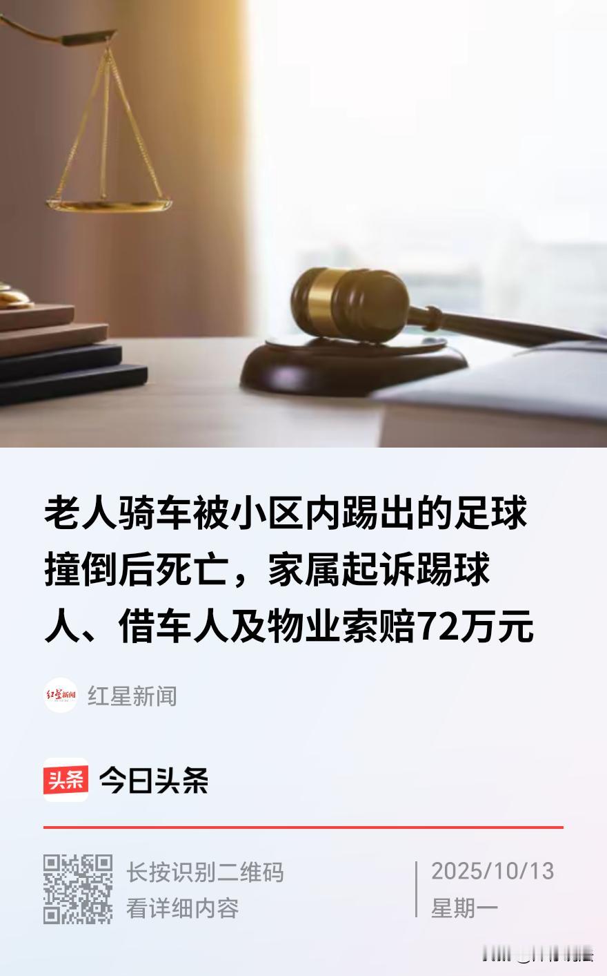 浙江宁波,一七旬大爷从好友处借来非法改装电动自行车,载着老友行驶在小区外的非机动车道上。不料,一男子带着六岁的儿子练习踢足球,一记力道稍大的传球从孩子脚下溜走,不偏不倚地撞上大爷电动车前轮,电动车瞬间失控侧翻,大爷头部重重着地,不省人事,乘车的老友也摔倒在地。送医后,经一个月抢救,不幸离世。大爷妻儿认为男子、借车好友及物业均有不可推卸的责任,告上法庭,索赔损失合计72万余元。法院这样判决。 据红星新闻10月12日报道,74岁的周某(化名)生于1950年,是一位退休老人,平时喜欢骑电动自行车代步。 2024年6月17日晚上7点42分左右,周某骑着好友李某(化名)改装过的电动自行车,没有佩戴头盔,搭载着李某,超速行驶在某小区北门外的非机动车道上。 当晚,裘某(化名)正带着他6岁的儿子在小区北门广场上踢足球。 在传球过程中,孩子没接住球,足球径直滚出小区北侧大门,飞到了外面的公共道路上。 恰巧的是,球撞上了周某正在骑行的电动自行车前轮,周某猝不及防,车辆瞬间失控倒地。 周某头部着地,当场昏迷不醒,李某则受了轻伤。 路人见状赶紧拨打急救电话,周某被紧急送往医院救治。 经过转院治疗,住院一个月后,他于2024年7月17日出院,转入一家康复医院进行后续治疗。 不幸的是,第二天晚上6点10分左右,周某被宣布临床死亡,死因为闭合性颅脑损伤特重型。 周某去世后,他的妻儿向法院提起诉讼,指控裘某、李某和小区物业公司对周某的死亡负有责任,要求三方赔偿死亡赔偿金、丧葬费、精神损害抚慰金等共计72万余元。 在法庭上,裘某辩称,自己无法预见到球会滚出小区并造成事故,且已积极垫付医疗费,不应承担主要责任。 李某则表示,出借车辆是出于好意,周某作为成年人应自行检查车辆安全,自己不应被追责。 物业公司则主张,小区广场是业主活动空间,他们无权干涉具体活动内容,且事件发生在小区外,不属于物业管理范围。 法院会如何判决呢? 第一,踢球的裘某是直接侵权人,负有直接责任。 《民法典》第一千一百六十五条第一款的规定,行为人因过错侵害他人民事权益造成损害的,应当承担侵权责任。 法院认为,裘某选择的踢球场地紧邻小区出入口,且门外就是公共道路,其作为一个理性的成年人,在从事此项活动时,负有对周边环境,特别是对小区外公共道路通行安全的审慎注意义务。 裘某应当预见到足球可能因控制不当而滚出小区,并对道路上的行人、车辆造成干扰或危险。然而,他疏于履行这一义务,使得其传球行为引发本次事故。 所以,裘某过错程度较大,法院酌情判定其承担40%的主要责任。 第二,借车的好友李某出借非法改装车辆,存在过错。 《民法典》第一千二百零九条规定,因租赁、借用等情形机动车……发生交通事故造成损害,属于该机动车一方责任的,……机动车所有人、管理人对损害的发生有过错的,承担相应的赔偿责任。 法院认为,李某作为车辆所有人,有义务确保其出借的车辆符合安全标准,不存在危及他人人身、财产安全的不合理危险。 本案中,涉案电动车经非法改装,多项指标不合格,属于隐患车辆,李某应当预见到该车在道路上行驶可能引发交通事故,仍然进行出借,存在过错。 综合考虑其过错是次要的原因,法院酌情判定其承担10%的赔偿责任。 第三,物业公司未尽到合理安全保障义务,存在一定过错。 《民法典》第九百四十二条规定,物业服务人……采取合理措施保护业主的人身、财产安全。 法院认为,物业公司作为小区的管理者,有义务尽到合理限度的安全保障义务。 具体到本案,物业公司应当清楚该广场的位置紧邻公共道路,对于居民在该区域内进行的、具有明显安全隐患的活动,物业公司不能简单地以“不干涉”为由完全放任,其负有一定的提示、警示或劝导义务,例如通过张贴告示等方式,以防范风险于未然。 物业公司未能提供证据证明其已履行上述合理的安全保障义务,存在管理上的疏漏。 所以,法院酌情判定物业公司承担15%的补充责任。 第四,死者周某的自身存在一定过错,应当自担部分责任。 《民法典》第一千一百七十三条规定,被侵权人对同一损害的发生或者扩大有过错的,可以减轻侵权人的责任。 周某作为完全民事行为能力人,驾驶非法改装车辆上路,还超速行驶与违法载人,还未佩戴安全头盔,这些因素与本次事故亦有关联。 法院认定,周某的过错对损害的发生存在“较大过错”,酌情判定周某自行承担35%的责任。 经过核算周某家属所主张医疗费等,确定损失为69.3万,另确定精神抚慰金分别为2万元、5000元和7500元。 最终,法院判决裘某、李某、某物业公司分别赔偿周某妻儿各项损失27.7万余元、7.4万余元和11.1万余元。 对此,您怎么看?