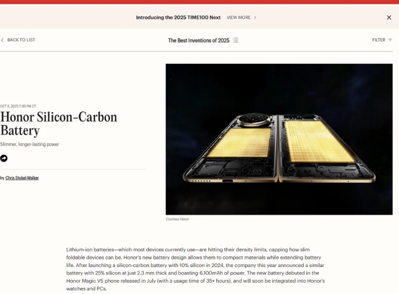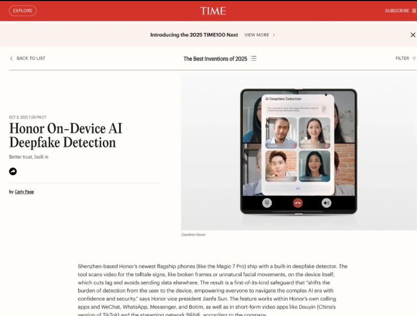 美国时代周刊近期发布的2025年最佳发明,多款中国科技产品登上榜单,包括华为Pura80 Ultra、比亚迪海鸥等产品。荣耀也登上主榜单,分别上榜了,青海湖刀片电池、端测AI换脸检测技术,荣耀是唯一斩获两项主榜大奖的中国品牌。