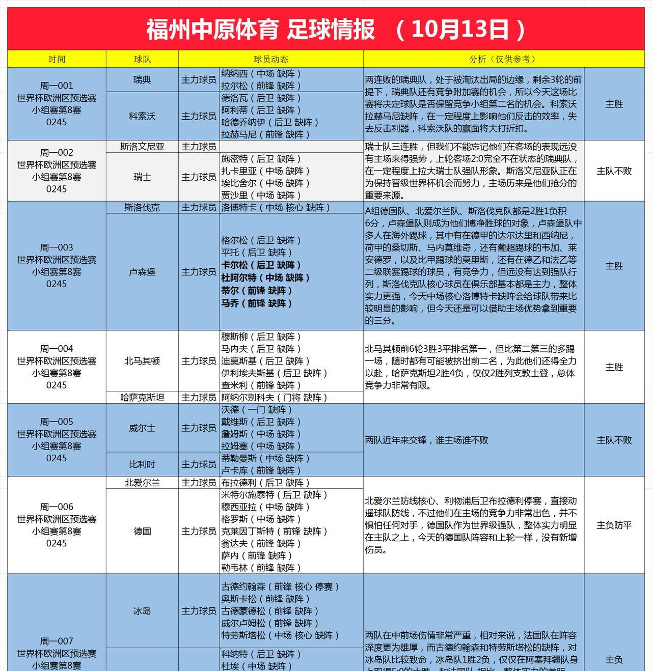 10月13日足球情报 斯洛伐克队和北马其顿队没有放松的资本,今晚两队主场出击全取三分,瑞典队今天能否苏醒,瑞士队和比利时队客场谨防丢分。
