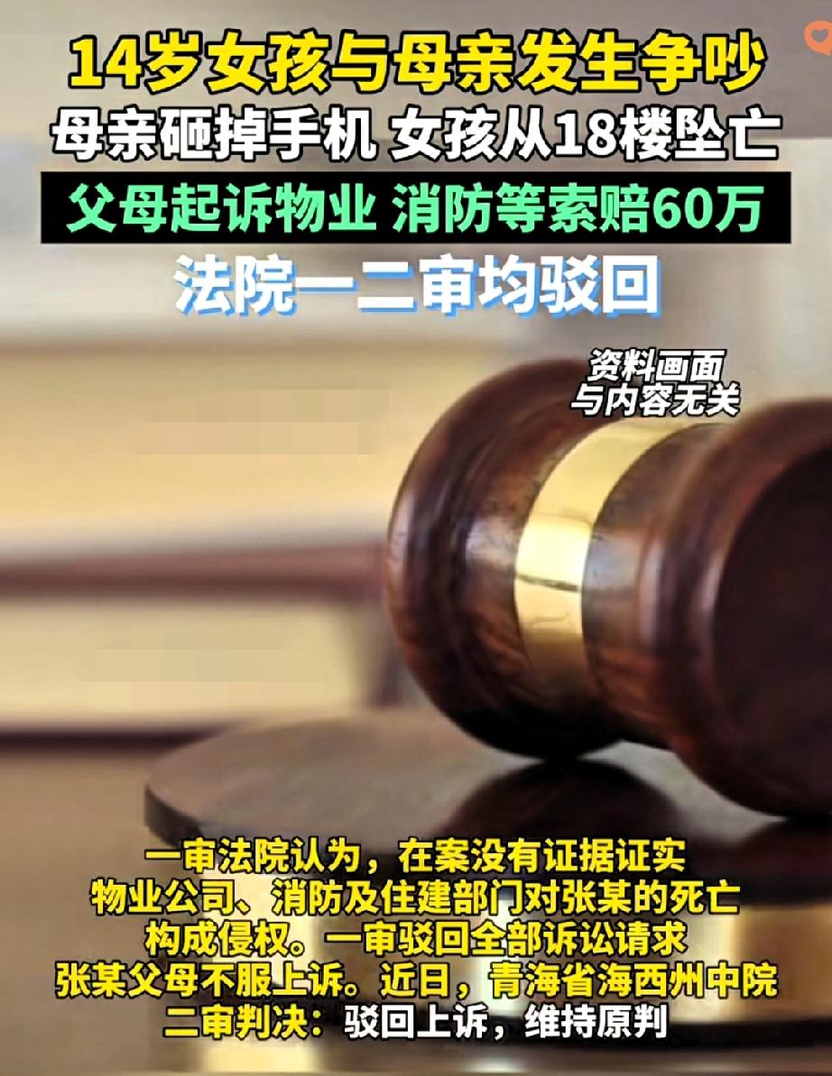 14岁女生因玩手机被砸和母亲争吵,转身从18楼跳下,父母起诉物业、消防索赔60万,结果法院两审都驳回了。 这事儿看得人心里发堵,更该让人醒神。 父母把责任推给物业没锁天台门、消防指导不当,可法院说得明白,天台门开着是消防要求,建筑也合格,这根本不是悲剧的根儿。 真正的问题,藏在砸手机的那一刻,藏在没接住孩子情绪的争吵里。 孩子走了,父母的痛能理解,但找别人背锅换不来真相。 14岁的孩子早懂跳楼的危险,她要的从不是手机,是被看见、被尊重的情绪出口。 可家人没接住,最后只能用极端方式告别。 法律能分清责任,却补不回逝去的生命。 你说,比起追究别人的错,是不是先学会和孩子好好说话更重要?