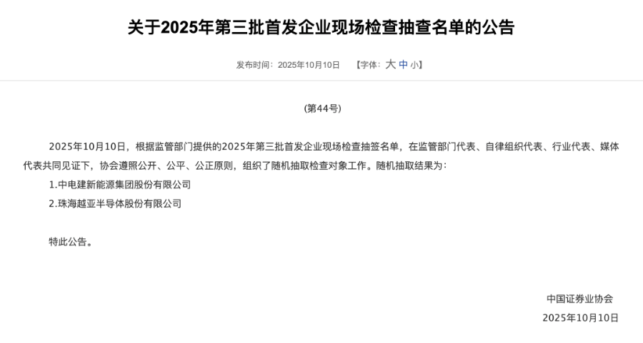 近日,中国证券业协会公布了2025年第三批首发企业现场检查抽签名单,中电建新能源集团股份有限公司(下称“电建新能”)与珠海越亚半导体股份有限公司(下称“越亚半导体”)被纳入检查范围。