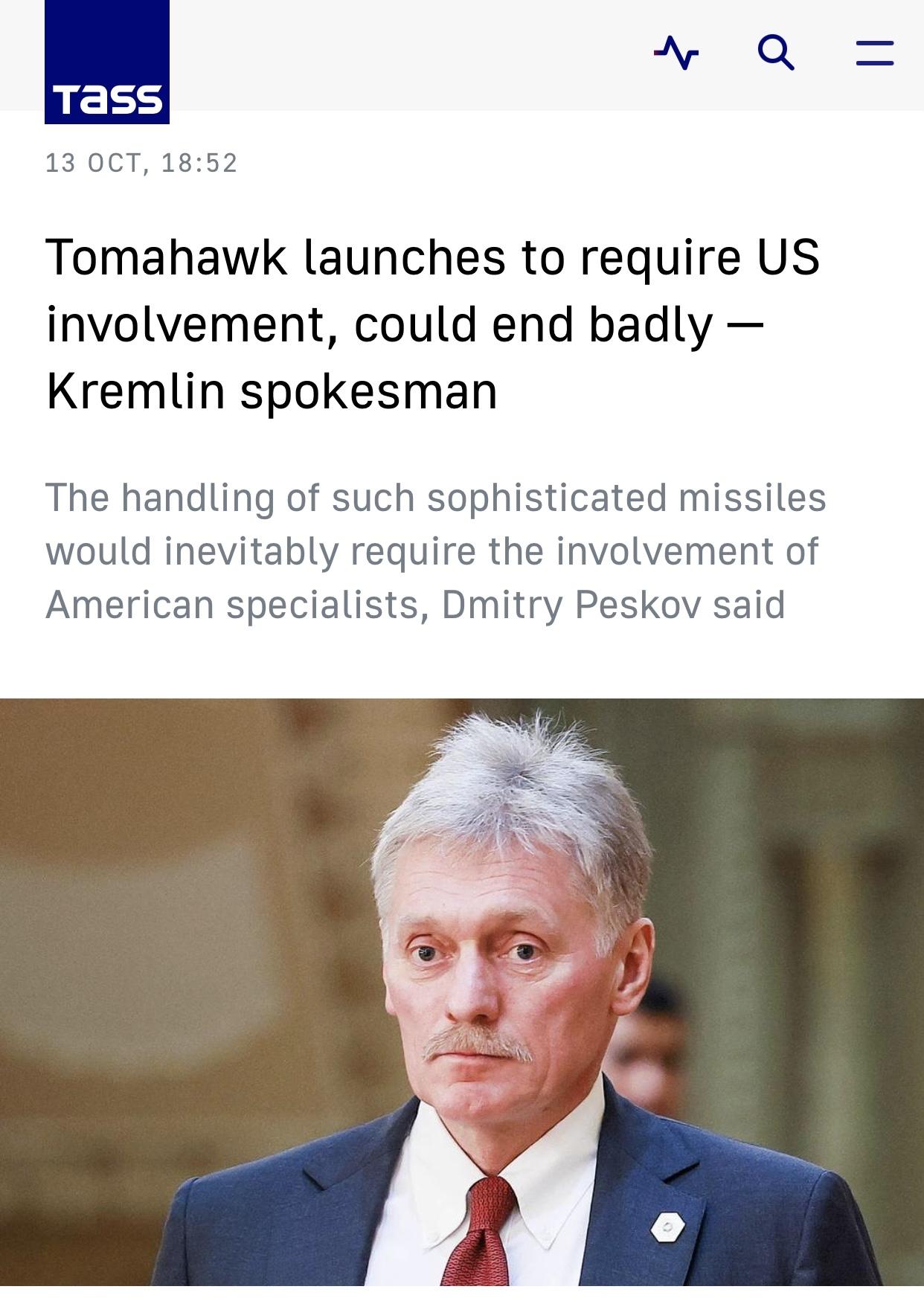 塔斯社:佩斯科夫回应特朗普称可能向基辅提供战斧导弹言论 塔斯社莫斯科10月13日电:克里姆林宫发言人德米特里·佩斯科夫告诉记者,发射战斧导弹需要美国人员的参与,因此,向基辅运送此类导弹可能会带来严重后果(Launching Tomahawk missiles would require the involvement of US personnel, so the potential delivery of such missiles to Kiev could have serious consequences, Kremlin Spokesman Dmitry Peskov told reporters)。 佩斯科夫说:”操作此类精密导弹不可避免地需要美国专家的参与。这是显而易见的事实。梅德韦杰夫的帖子说的就是这个”,在被要求对俄罗斯联邦安全会议副主席德米特里·梅德韦杰夫在社交媒体上发布的帖子(称此类武器转让对所有人来说都可能“以糟糕收场”)言论置评时,他这样回应道。 “任何关注此事的专家都对此了如指掌,”佩斯科夫补充道。 报道说,早前,梅德韦杰夫在俄罗斯最大的即时通讯软件上写道,向基辅运送战斧导弹对任何人都没有好处。他强调,发射中的战斧导弹是携带核武器还是常规武器是无法确定的,这一点已反复强调过。“进行发射的不是亲欧盟示威者基辅,而是美国”,这位俄罗斯联邦安全会议副主席指出。 报道的原标题是《Tomahawk launches to require US involvement, could end badly — Kremlin spokesman》(发射战斧导弹需要美国参与,可能会以糟糕的结局结束——克里姆林宫发言人)。