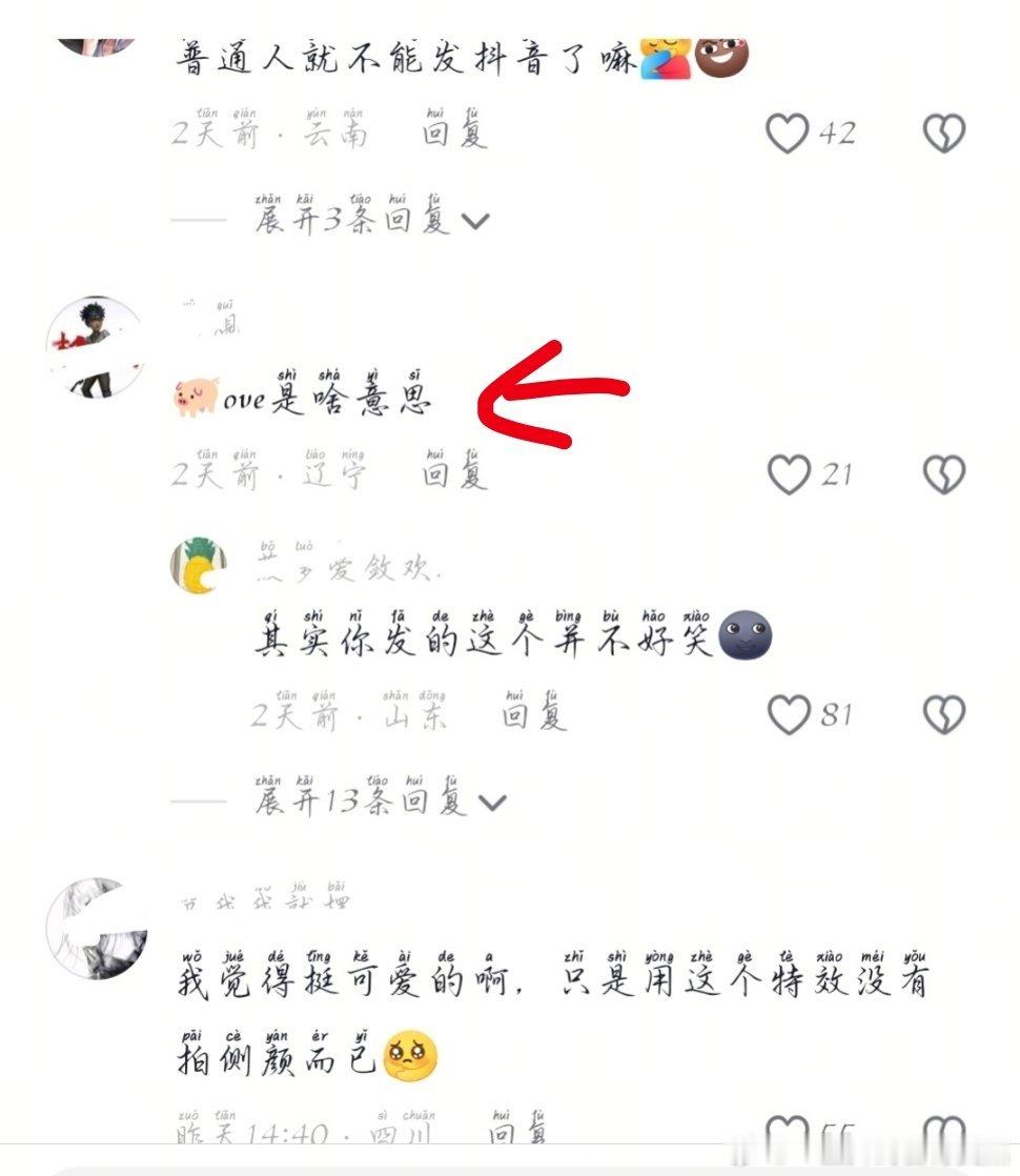 原视频是一个萌萌的小女孩用了“ove”特效发了正脸自拍,评论区一堆人阴阳怪气,说是人家用错了,其实这个特效模板图上就是用正脸拍,只是侧脸拍比较火(没人规定一定要咋拍)。不知道有些人戾气为啥这么重