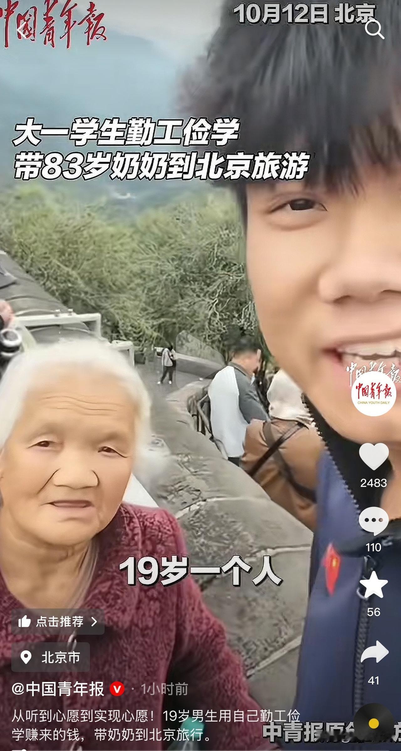 太孝顺了!近日,一个19岁的大学生用勤工俭学的钱,带83岁的奶奶来北京旅游,这事真是狠狠戳中我了。 当孙子了解到奶奶心中一直有一个“北京梦”后,他开始利用课余时间勤工俭学,他想攒钱带奶奶亲眼看一看北京天安门。 从今年2月份开始兼职,终于在国庆期间攒够了钱。 他带着奶奶第一次坐飞机,第一次爬长城、第一次在天安门看升旗,短短的几天,奶奶脸上的笑容就没有消失过。 有多少人的19岁还在享受青春,伸手朝父母要钱,可他却在为了老人的梦想,自己去兼职,用汗水和时间一点点攒出带奶奶旅游的钱。 老人年纪大了,可能没什么机会出远门,更别说去北京这样的大城市了。 他就用自己的行动,给了奶奶一段特别的回忆。在他的心中,奶奶的晚年幸福比自己吃顿美食,或者穿衣服都重要。 这也让我明白了,爱其实非常简单,就是在心里惦记着对方,然后对此付出行动。 我觉得咱们做晚辈的,真得像他多学习,多关心家里的老人。 别等他们年纪大了、走不动了,才想起来尽孝。趁着现在,多陪陪他们,带他们去看看没看过的风景,吃没吃过的美食。 说不定咱们一个小小的举动,就能让老人开心好久好久。