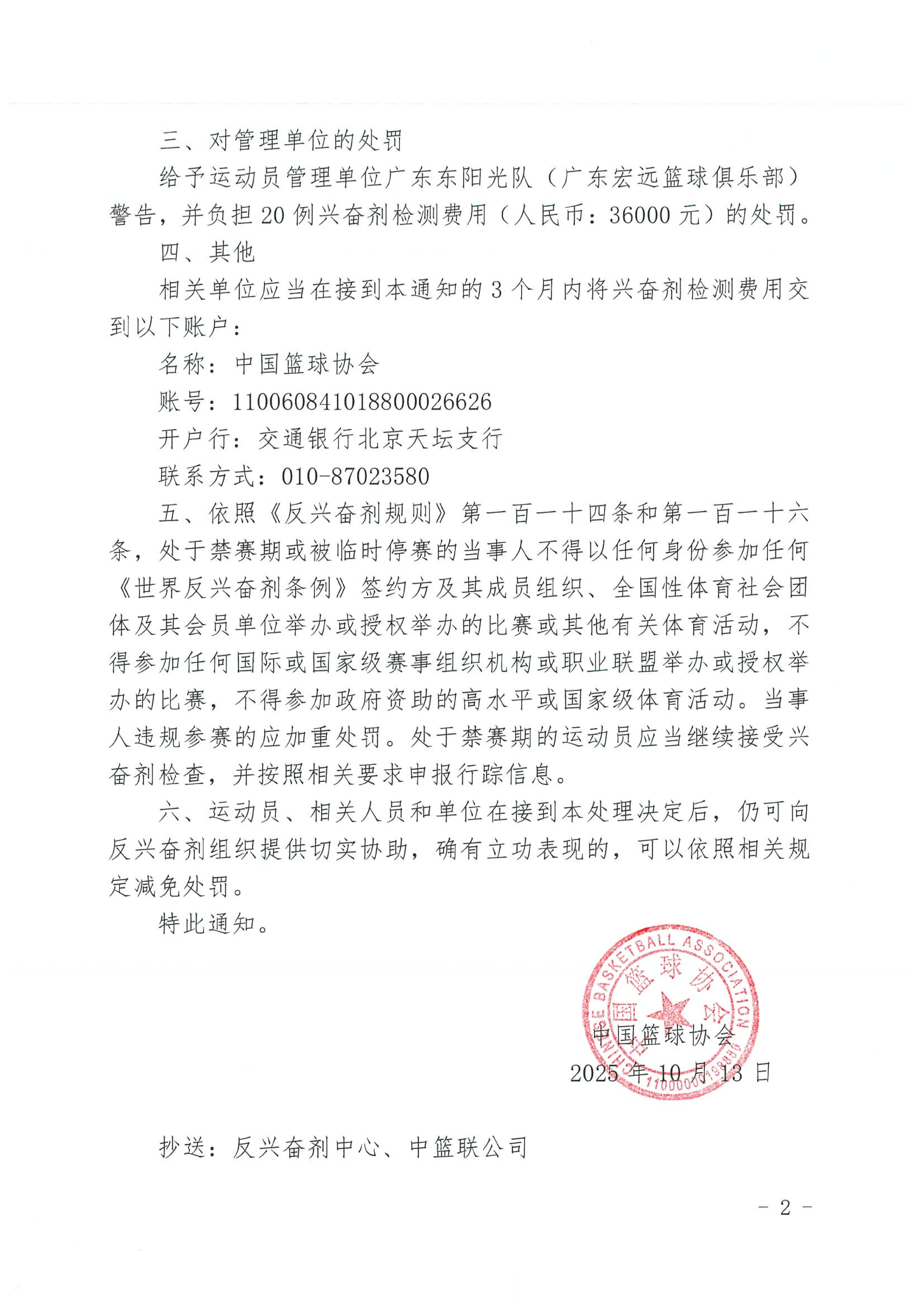 中国篮协发布对吉伦沃特兴奋剂违规处理通知: