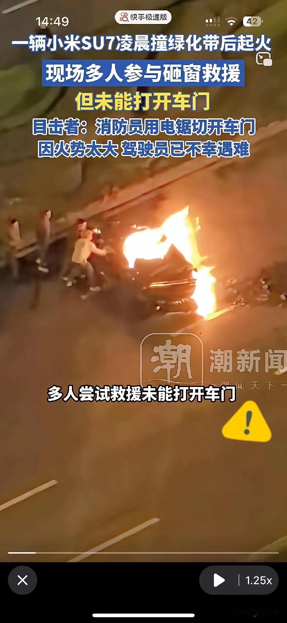 雷军,别在嘴硬了,多少人命为你的嘴硬买单。在成都一辆小米汽车撞在了绿化带上起火自燃,许多目击者看到后上前抢救,都打不开车门,因为电车只要撞了电池受损,隐藏型把手根本打不开。 这场发生在10月13日凌晨成都天府大道的悲剧,撕开了新能源汽车华丽外表下的致命隐患。 31岁的邓某某驾驶小米SU7 Ultra,以明显超速的状态撞向前车,冲过绿化带翻滚到对向车道后迅速起火。多名路人毫不犹豫地冲上去救援,徒手砸窗、寻找工具,双手流血却依然无法打开那扇死亡之门。 警方通报揭示了司机涉嫌酒驾的事实。但另一个残酷的问题随之浮现:为何那么多路人都打不开一扇救命的车门? 那道打不开的门背后,藏着一个关于设计的残酷真相。小米SU7采用的是固定式半隐藏门把手,看起来时尚简洁。雷军曾自豪地介绍,这种设计“通过按压内部微动开关实现电动解锁,无需物理抬起就能开门”。 在车辆碰撞导致断电的紧急情况下,这种依赖电控的门把手很可能瞬间失效。中保研的数据显示,配备电子门把手的车型在侧面碰撞中车门弹出成功率仅67%,远低于机械门把手的98%。 这不是设计美学与安全性的第一次碰撞。车内的机械拉手位置靠下,车外根本没有机械拉手。当驾驶者昏迷,车外救援者只能砸窗伸手去摸那个难以触及的救命机关。 眼睁睁看着生命在眼前消逝而无能为力,这是怎样的一种绝望? 小米精心构建的安全神话同样在烈火中接受考验。雷军在技术发布会上重点讲解的电芯倒置设计、17层高压绝缘防护,甚至应用在军事装备的“防弹涂层”。 这些听起来坚不可摧的技术堡垒,在这场极端碰撞中似乎并未发挥宣称的效果。整辆车被烧得只剩下铁架子,触目惊心。 令人愤慨的是,事故发生后小米选择了沉默。当舆论沸腾、股价暴跌近8%时,雷军的微博依然在展示新疆测试新车的美好画面。 难道那些流血救援的双手,那些在烈火中逝去的生命,都不及一场宣传秀重要吗? 监管的脚步已经响起。工信部9月发布的《汽车车门把手安全技术要求》强制性国家标准征求意见稿,明确要求每个车门应配置具备机械释放功能的车门外把手。 各位读者你们怎么看?欢迎在评论区讨论。