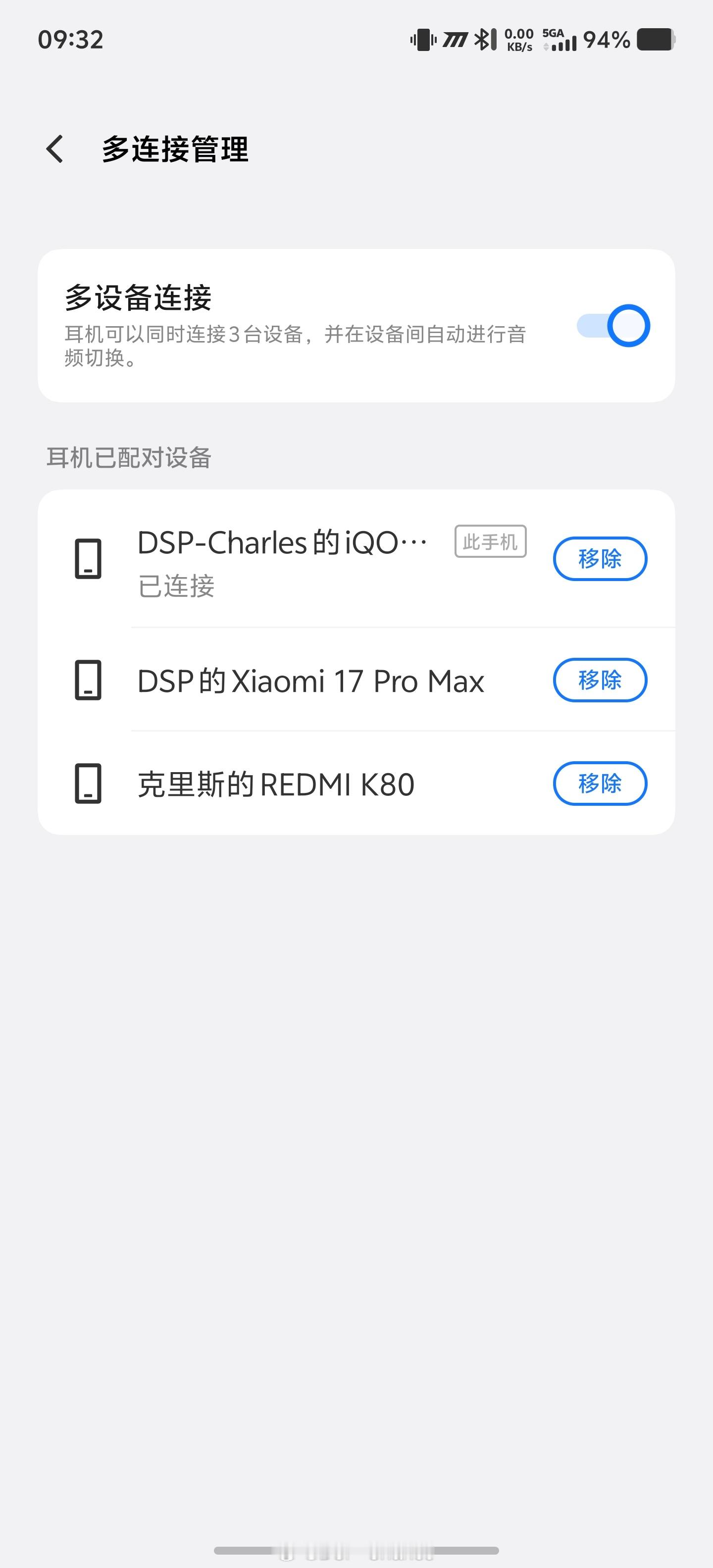 vivo这个耳机做的挺好的,降噪、调音、软件完成度都比较高,多设备支持到了3个。
